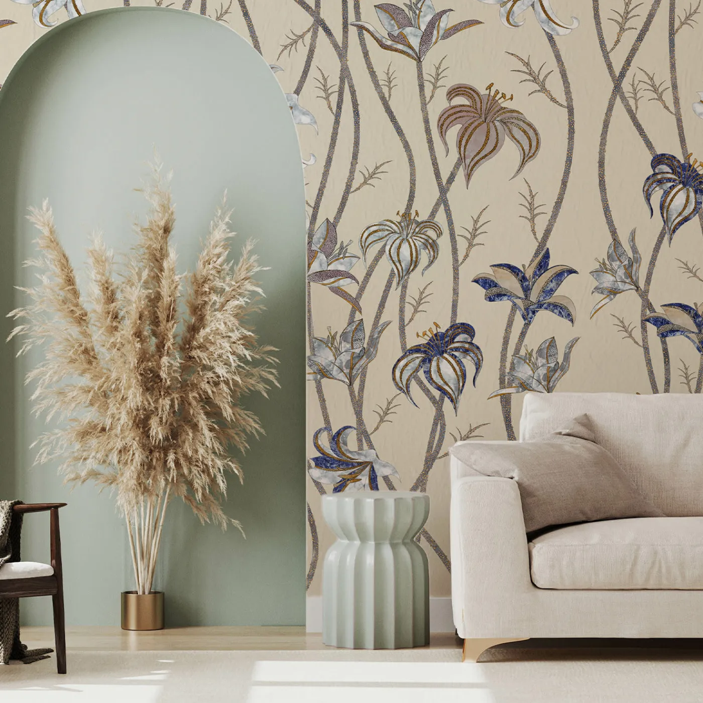 Steli sottili e lunghissimi corrono lungo tutta la parete, per terminare come fiori leggerissimi di Lilium Lancifolium, meglio conosciuto come Giglio di Tigre. Osservando attentamente i disegni di questi fiori, è possibile scorgere colori e texture che fanno parte di un’altra realtà: l’antica tecnica denominata Scagliola, l’Arte della Luna. La carta da parati Fiori è liberamente ispirata a questa antichissima arte, che consisteva nella sapiente lavorazione del gesso. Questo veniva poi utilizzato per sostituire materiali più preziosi.