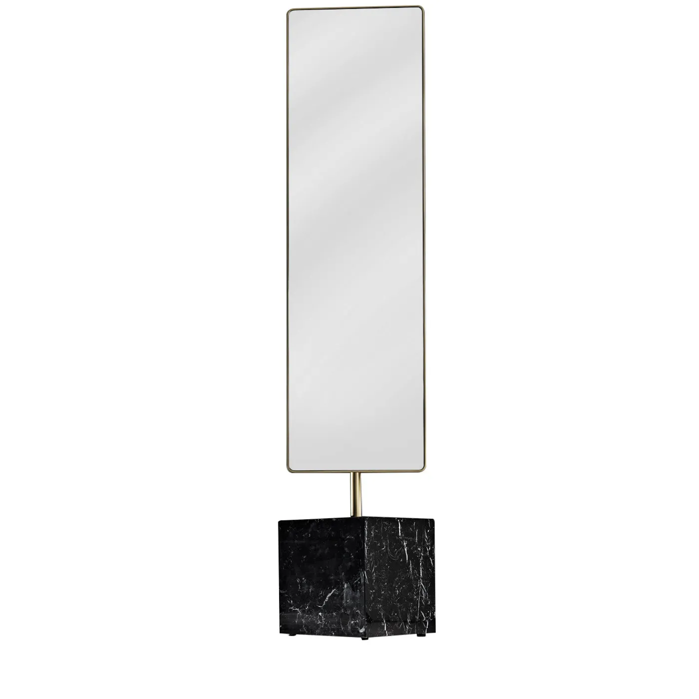 Una splendida combinazione di materiali nobili in un elegante equilibrio di volumi geometrici, questo specchio è funzionale e sofisticato. Presenta una base in marmo nero Marquina che sostiene uno stelo e un supporto per lo specchio in ottone con finitura satinata chiara. Il pannello posteriore è in cuoio grigio chiaro con cuciture marrone scuro.