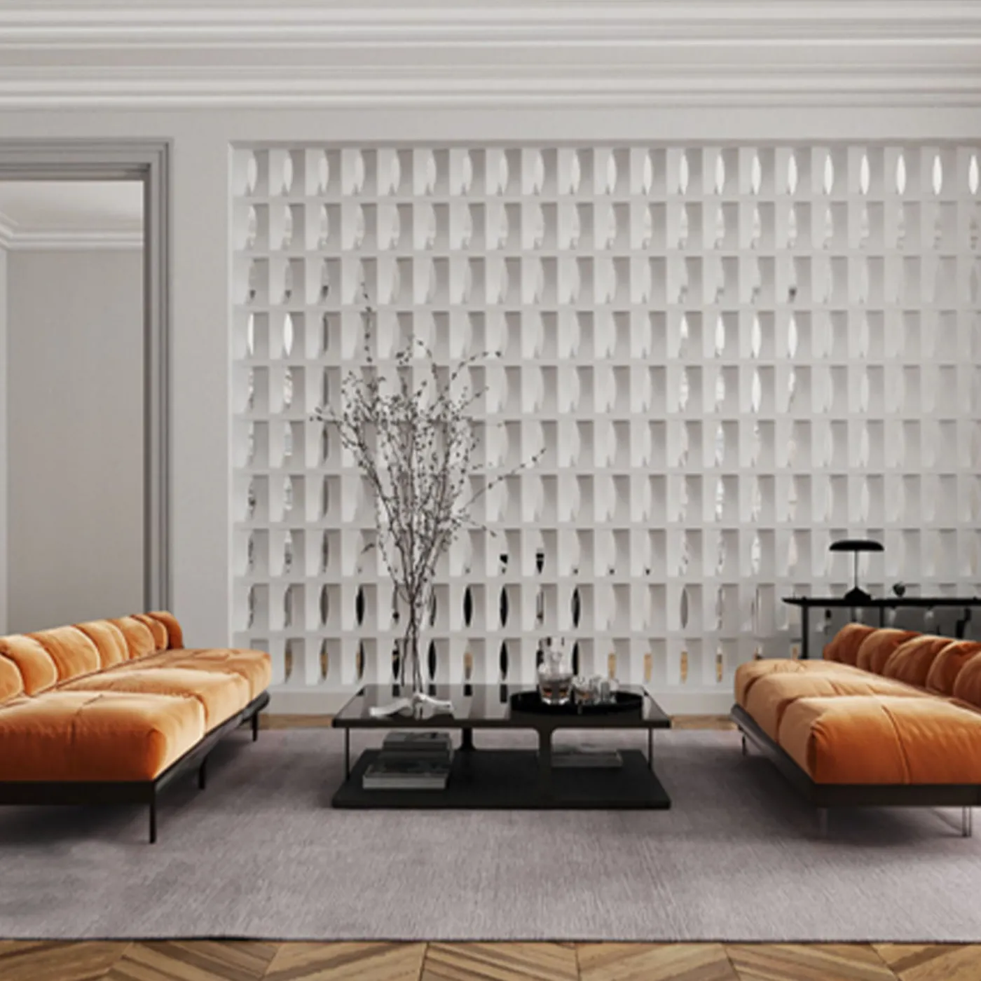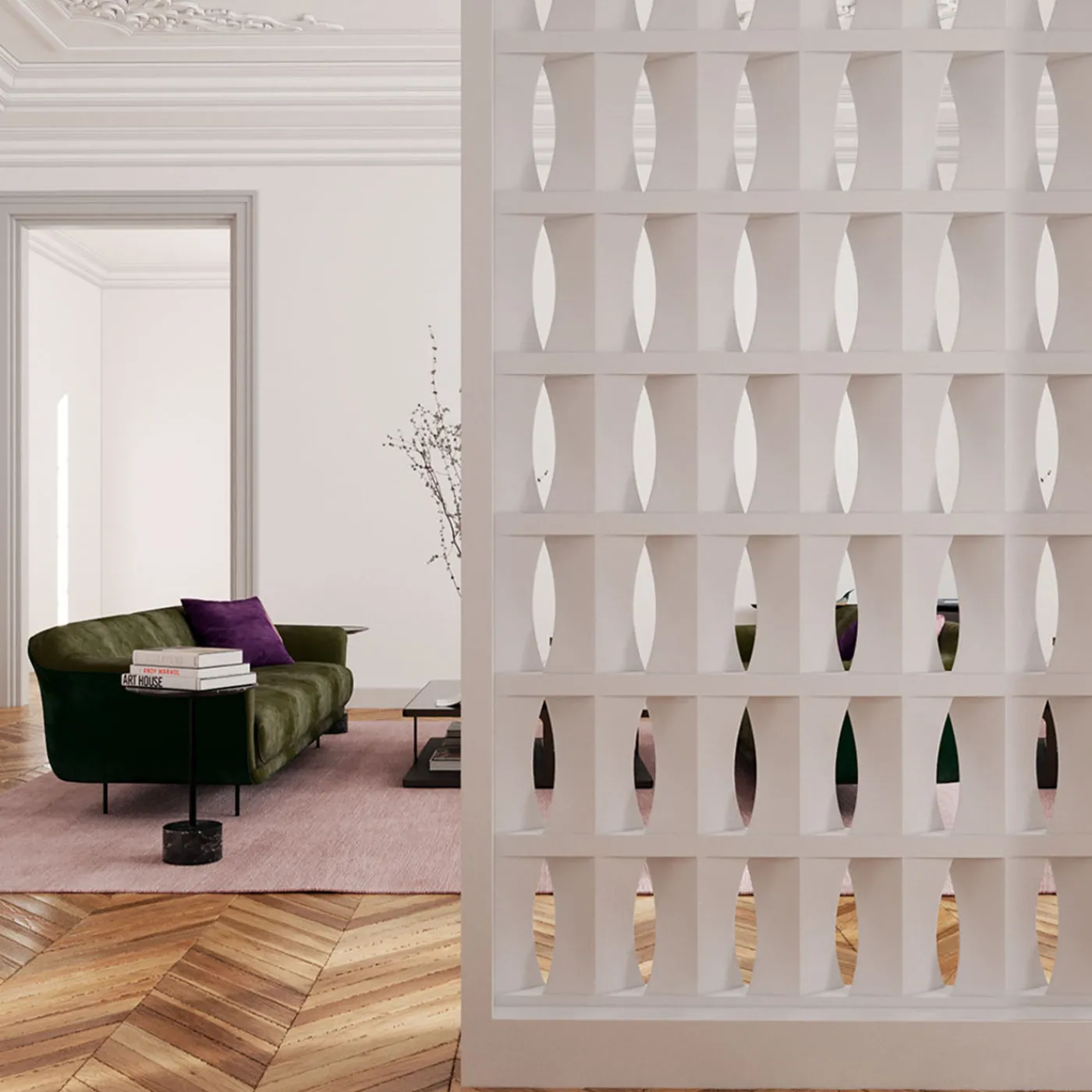 Questo screenblock si ispira alle linee audaci della Brasília degli anni ’60 di Oscar Niemeyer.I blocchi creano partizioni che mantengono la continuità visiva tra gli spazi, combinando curve complesse con forme geometriche pure. Progettati per essere posizionati stabilmente su una base rialzata, i blocchi possono essere verniciati in qualsiasi colore dopo l’installazione. Con un trattamento protettivo, sono adatti anche ad ambienti esterni. Il prezzo visualizzato si riferisce all’ordine minimo di 0,9 m² (3 confezioni da 5 blocchi ciascuna).