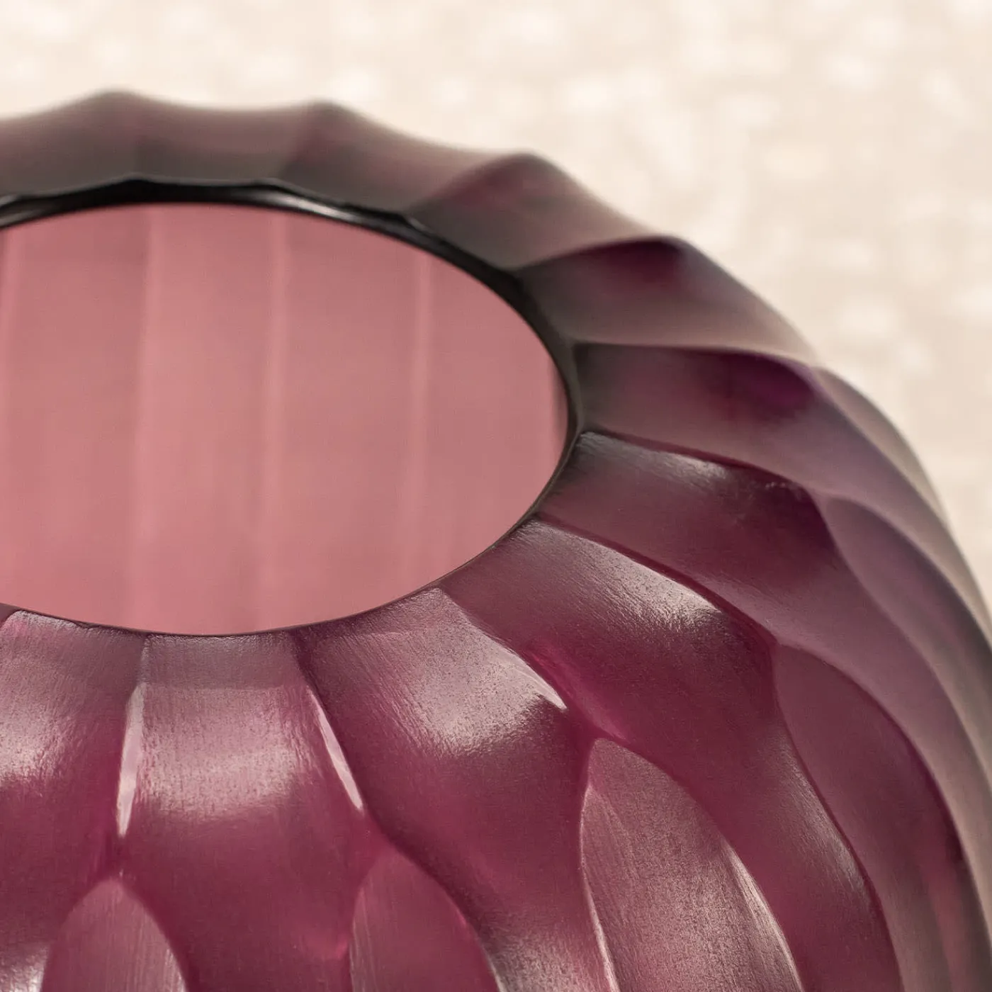 Chiamato così per la sua giocosa somiglianza con il riccio di mare, questo singolare vaso è una vetrina dell’esperienza artigianale. Soffiato a bocca in un vaso, il corpo rigonfio viene inciso a freddo per ottenere la sua caratteristica texture scanalata, seguita da una fase di perfezionamento con la tecnica della molatura. I meravigliosi riflessi della luce derivano dall’interazione tra la luce e i suoi dettagli dinamici.