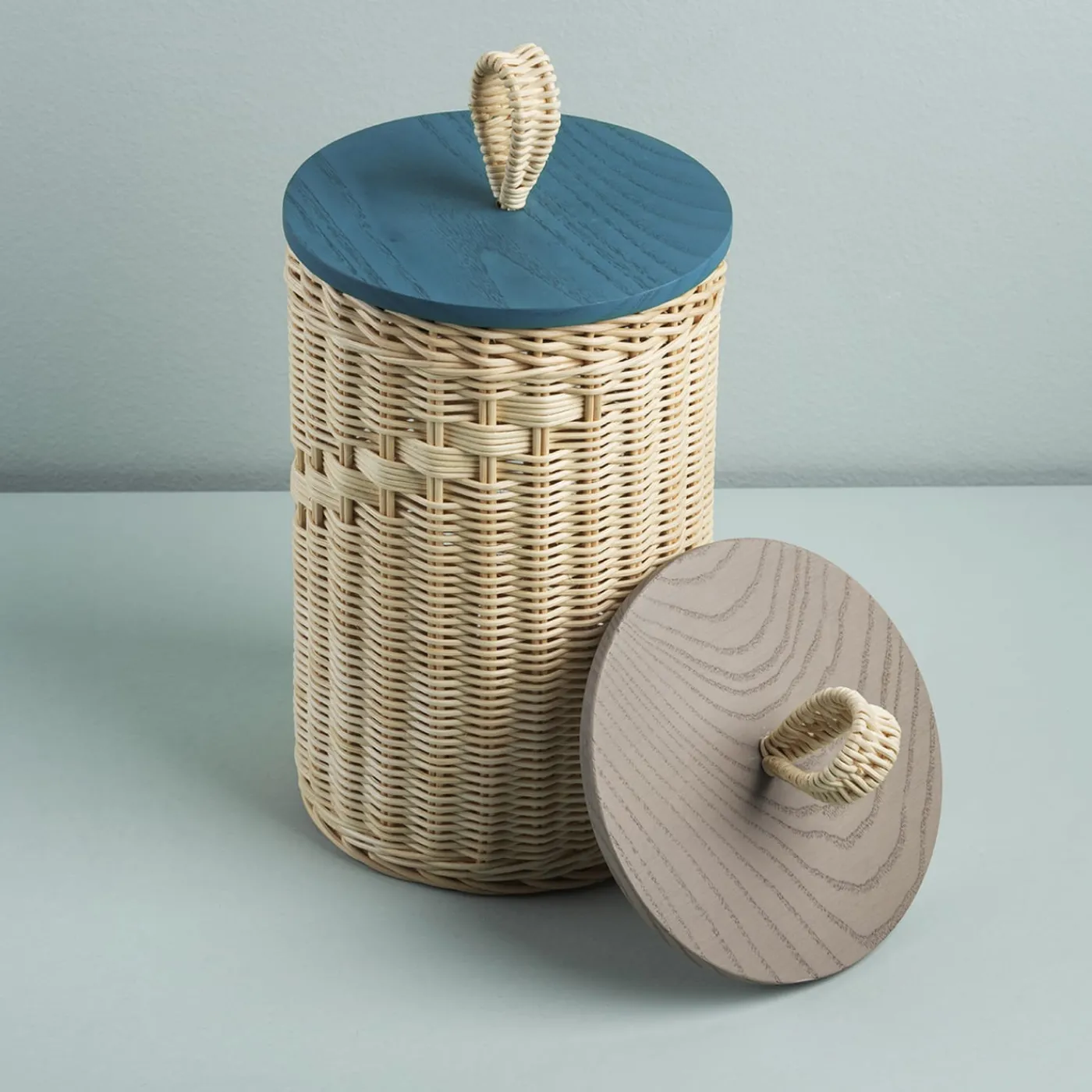 Versatilità ed estetica si intrecciano quasi letteralmente in questo squisito contenitore cilindrico in vimini, sormontato da un coperchio piatto e rotondo in frassino massiccio tinto di verde acqua secondo il metodo dei pori aperti. Protetti da uno speciale trattamento a base d’acqua, il contenitore e l’ansa, minuziosamente intrecciati a mano, vantano trame intricate che riflettono l’esperienza degli artigiani che li hanno realizzati. Chiedete al Concierge le opzioni di colore rosa, naturale e nocciola per il coperchio.
