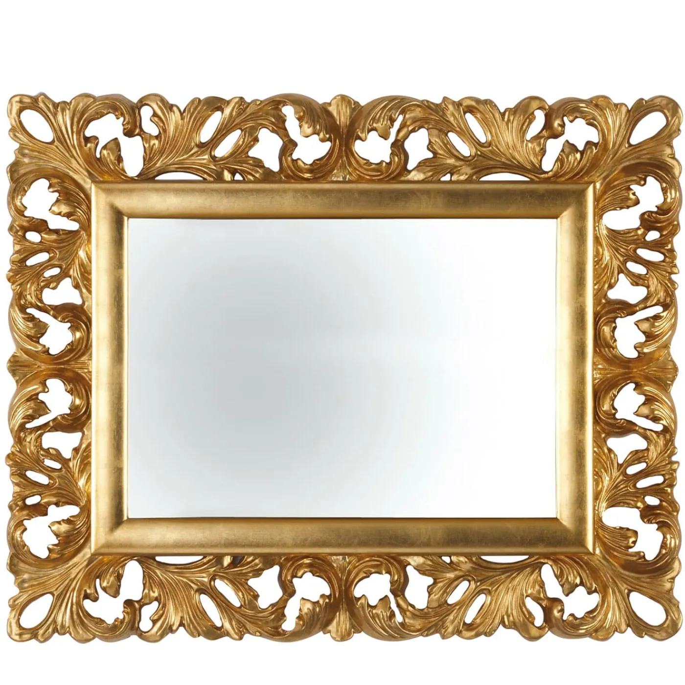 Uno splendido e intricato disegno traforato caratterizza l’audace cornice fitomorfa di questo specchio, un pezzo che trasuda opulenza da ogni dettaglio. Reinterpretazione del tradizionale stile barocco, colpisce per il suo rivestimento in foglia d’oro anticato, una scelta che dichiara la sua opulenza al primo sguardo. Il pezzo può essere liberamente appeso sia in orizzontale che in verticale.