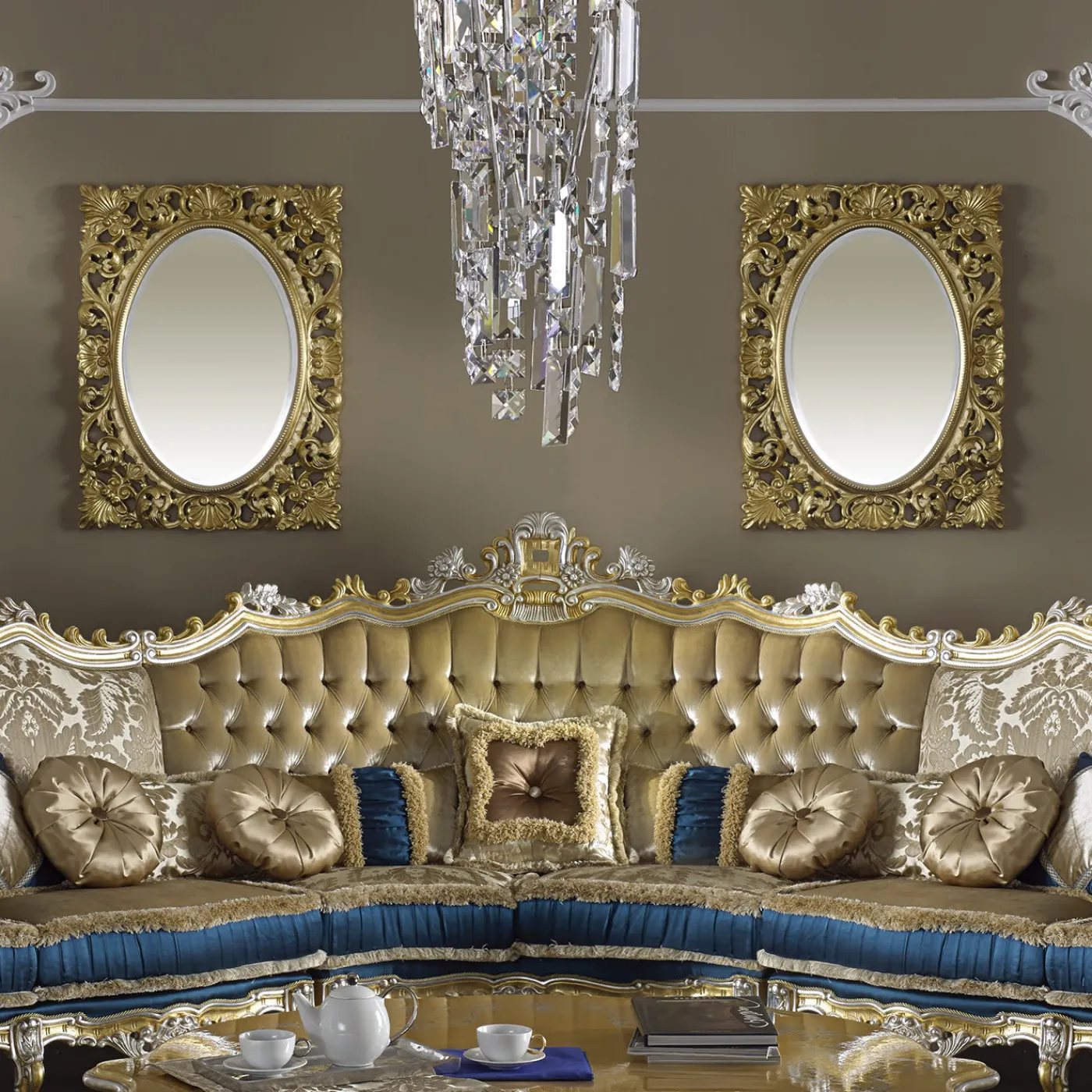 Questo specchio ovale si trova all’interno di una cornice in legno ornatamente intagliata e rifinita in foglia d’oro. Il suo aspetto barocco aggiungerà un tocco di stravaganza e fascino a qualsiasi ambiente. Non passerà inosservato in un ingresso, in un soggiorno o in una camera da letto. L’articolo è interamente realizzato a mano in una delle regioni italiane più famose per la produzione di mobili, utilizzando tecniche tradizionali.