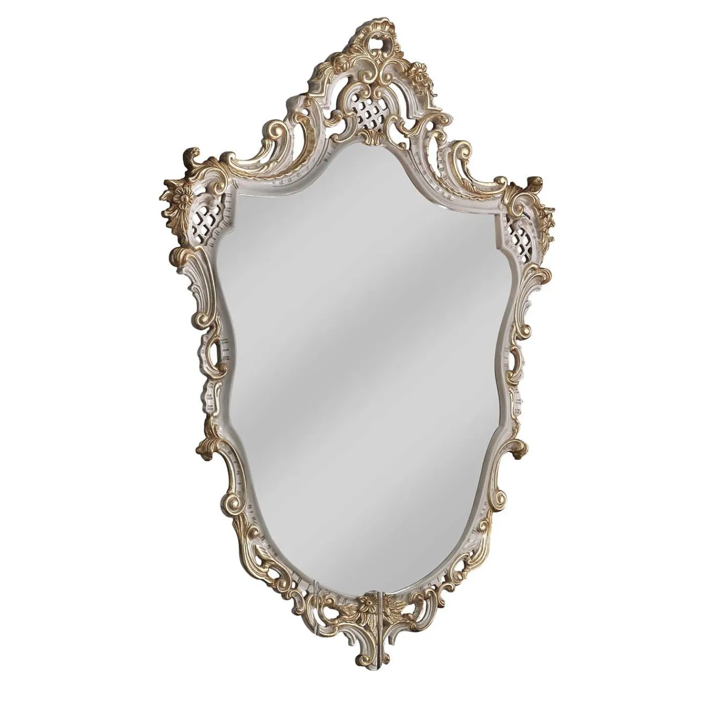 La forma sinuosa di questo elegante specchio disegnato dall’artista italiano Morello Gianpaolo è impreziosita da una cornice in legno laccato avorio con dettagli in foglia d’oro. Questo meraviglioso pezzo è perfetto per arredare un ambiente lussuoso come un ingresso, un soggiorno, una sala da pranzo o una camera da letto. Completamente personalizzabile.