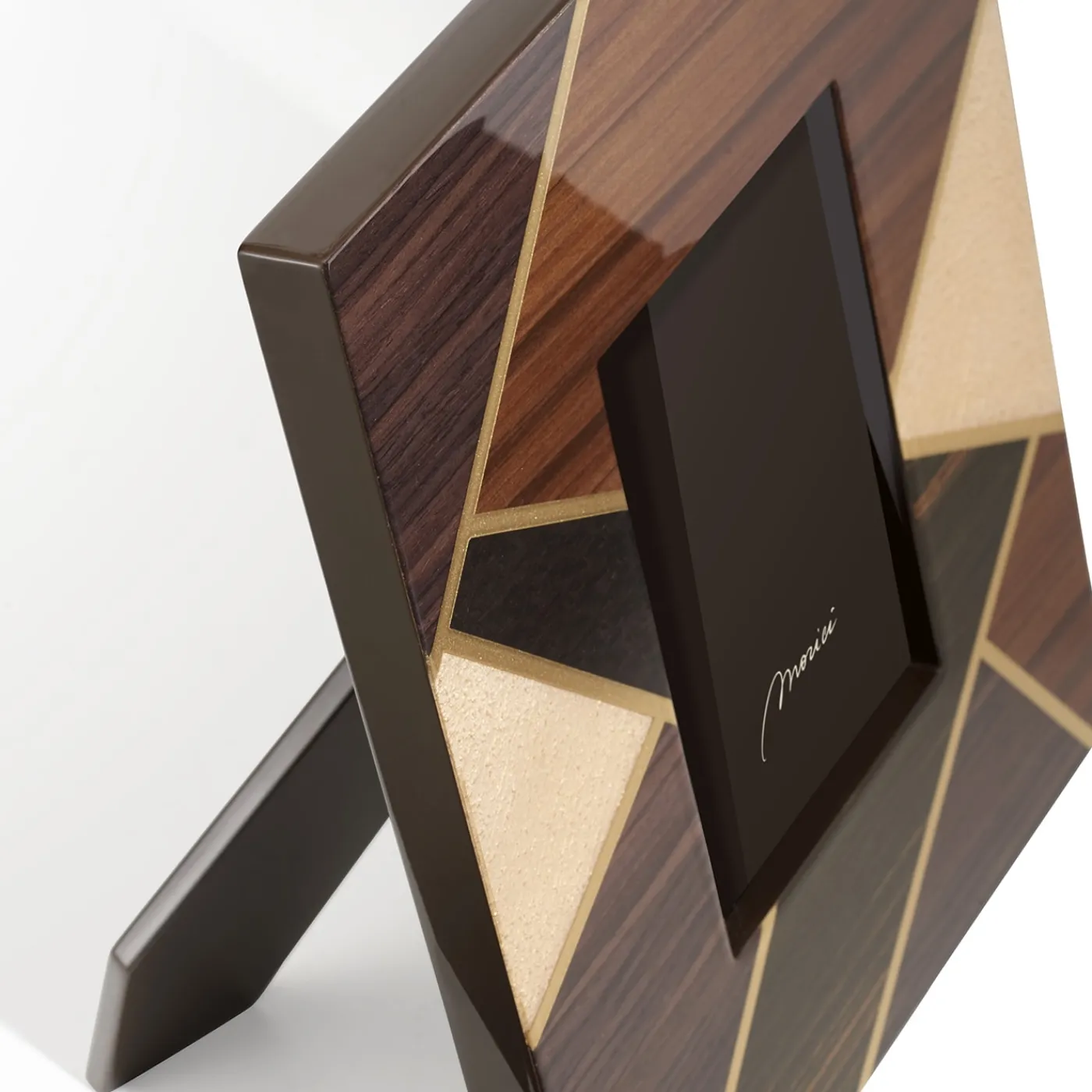 Abilmente realizzato a mano, questo design della collezione Tellux Vulcano è la soluzione perfetta per i ricordi preziosi che meritano un portafoto altrettanto prezioso. Le linee dorate compongono una rete dinamica che si estende su tutto il perimetro e che sottolinea ulteriormente il contrasto tra i pregiati intarsi in Bolivar, palissandro, ebano e frassino. Una finitura spazzolata e specchiata completa questo pezzo elegante e singolare.
