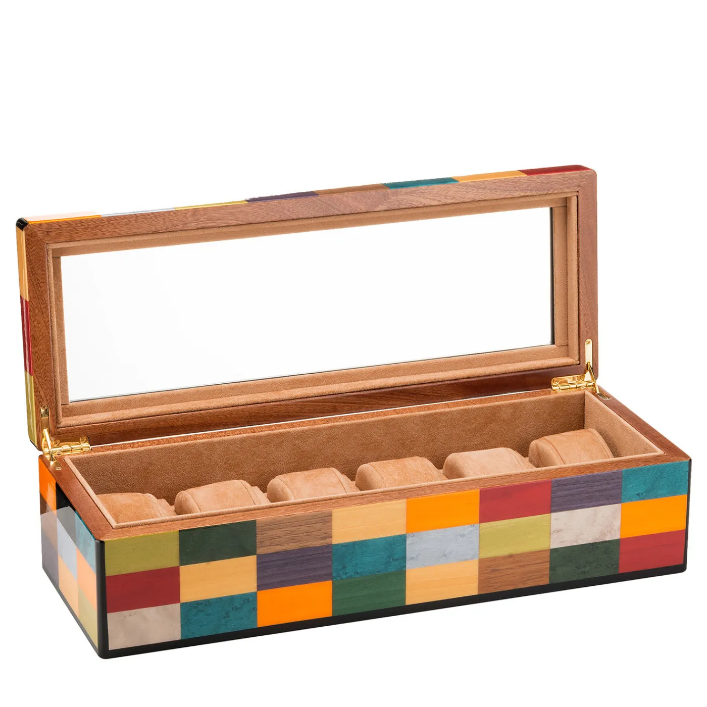 Superlativa vetrina di artigianato, questa custodia per orologi sarà un’aggiunta originale a qualsiasi vanity della camera da letto, soprattutto se esposta con il Portagioie Venezia Rialto. Realizzato in mogano con un intarsio di rettangoli colorati impreziositi da una finitura spazzolata e lucida, è rivestito in Alcantara beige e arricchito da un vetro a specchio sul piano interno. Può contenere fino a 6 orologi ed è arricchito da dettagli in metallo dorato.