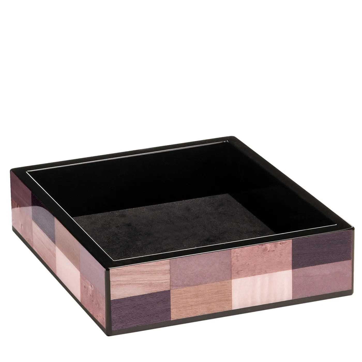 Accento elegante e affascinante per una moderna consolle d’ingresso, questo vassoio svuota tasche unisce praticità ed estetica in un design elegante e raffinato, realizzato magistralmente a mano in legno. Foderato in Alcantara nera, la sua struttura interna si contrappone all’audace motivo a scacchi intarsiato sulla superficie esterna in legno, impreziosita da lucidi toni pastello di rosa, beige e marrone.