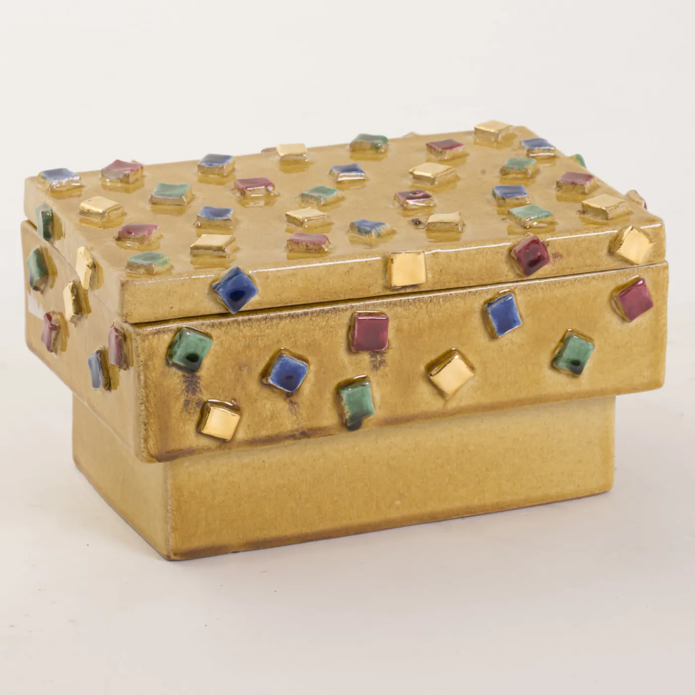 Questa giocosa maiolica è stata realizzata con passione, tecniche tradizionali e fantasia dai maestri ceramisti dell’atelier toscano ND Dolfi. Chiamata scatola di caramelle, questa maiolica è caratterizzata da una superficie smaltata in ocra e ornata da quadratini colorati in rilievo.