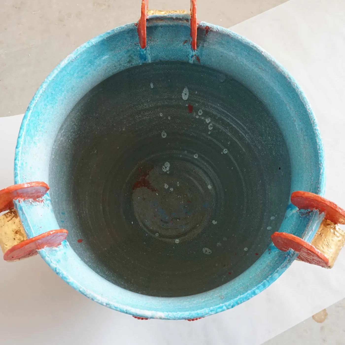 Questo vaso etrusco azzurro, unico nel suo genere, è interamente realizzato e tornito a mano in ceramica italiana di altissima qualità con applicazioni a rilievo in rosso e dettagli in oro zecchino, manici e base. Questa creazione del 1999 di Ceramica ND Dolfi unisce una forma tradizionale a colori moderni e brillanti. All’interno possono essere presenti residui di colori diversi dovuti al processo di lavorazione artigianale.