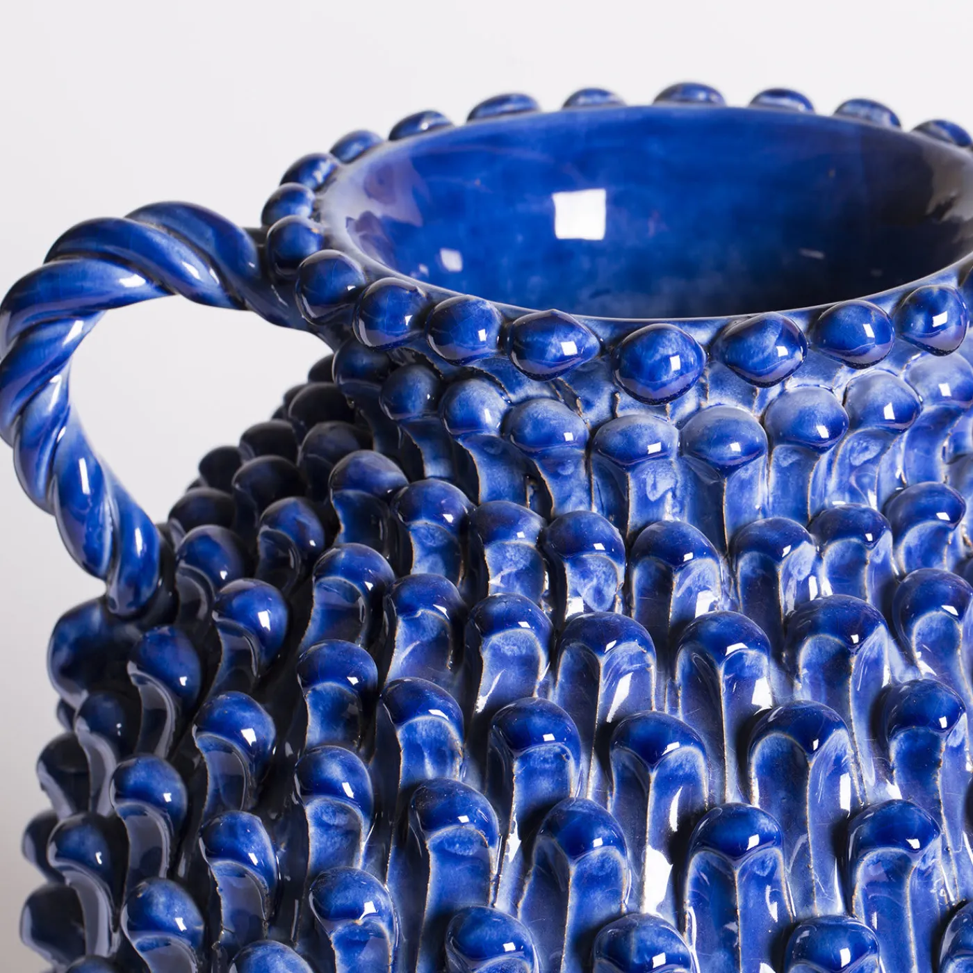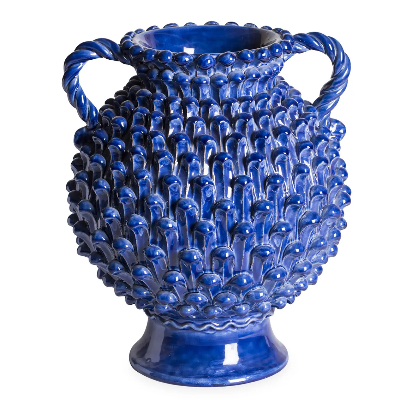Questo splendido vaso in maiolica blu è stato realizzato a mano dai maestri ceramisti dell’atelier toscano ND Dolfi. L’intricato motivo a pigna conferisce una splendida texture a questo pezzo artigianale che si distingue per il design a doppio manico.