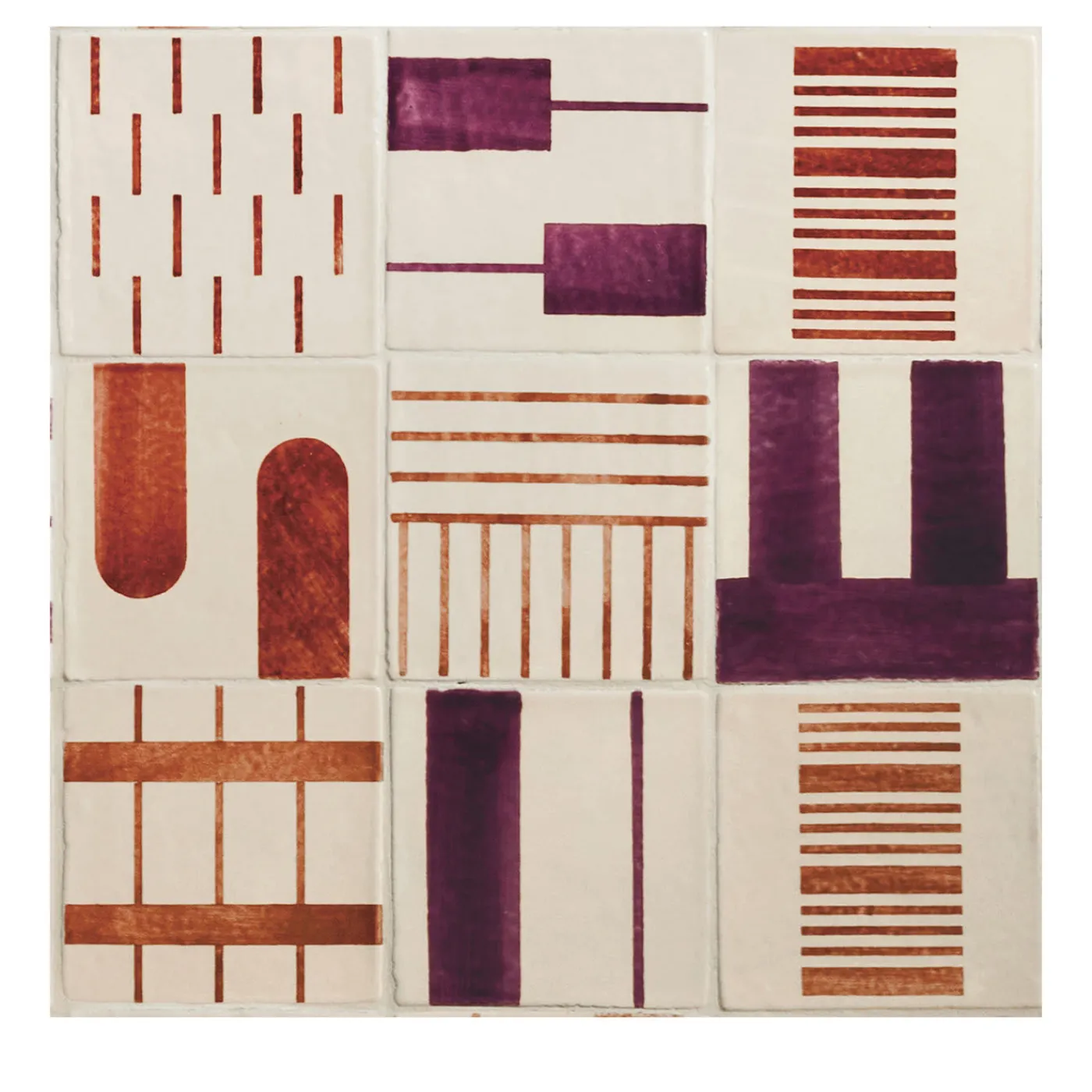 Questo set di 44 piastrelle in ceramica è stato realizzato a mano dai maestri Nicolò e Fausto Parrinello per dare personalità e colore a interni altrimenti monotoni. Perfetto per pavimenti e rivestimenti, conta piastrelle in terracotta di 15×15 cm smaltate a mano in bianco burro e decorate con motivi assortiti in viola, rosso melograno e rosso mattone. Ogni pezzo è interamente realizzato a mano.