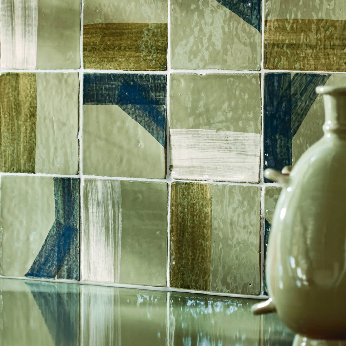 Smaltate in bianco crema e decorate a mano con una combinazione di ampie pennellate blu e verde salvia, le 45 piastrelle in cotto che compongono questo set sono una sintesi di minimalismo e freschezza. Ogni piastrella (15×15 cm) è il risultato dell’attento lavoro manuale dei maestri Nicolò e Fausto Parrinello, che realizzano ogni pezzo a Caltagirone, in Sicilia, città rinomata per la sua lunga tradizione ceramica.