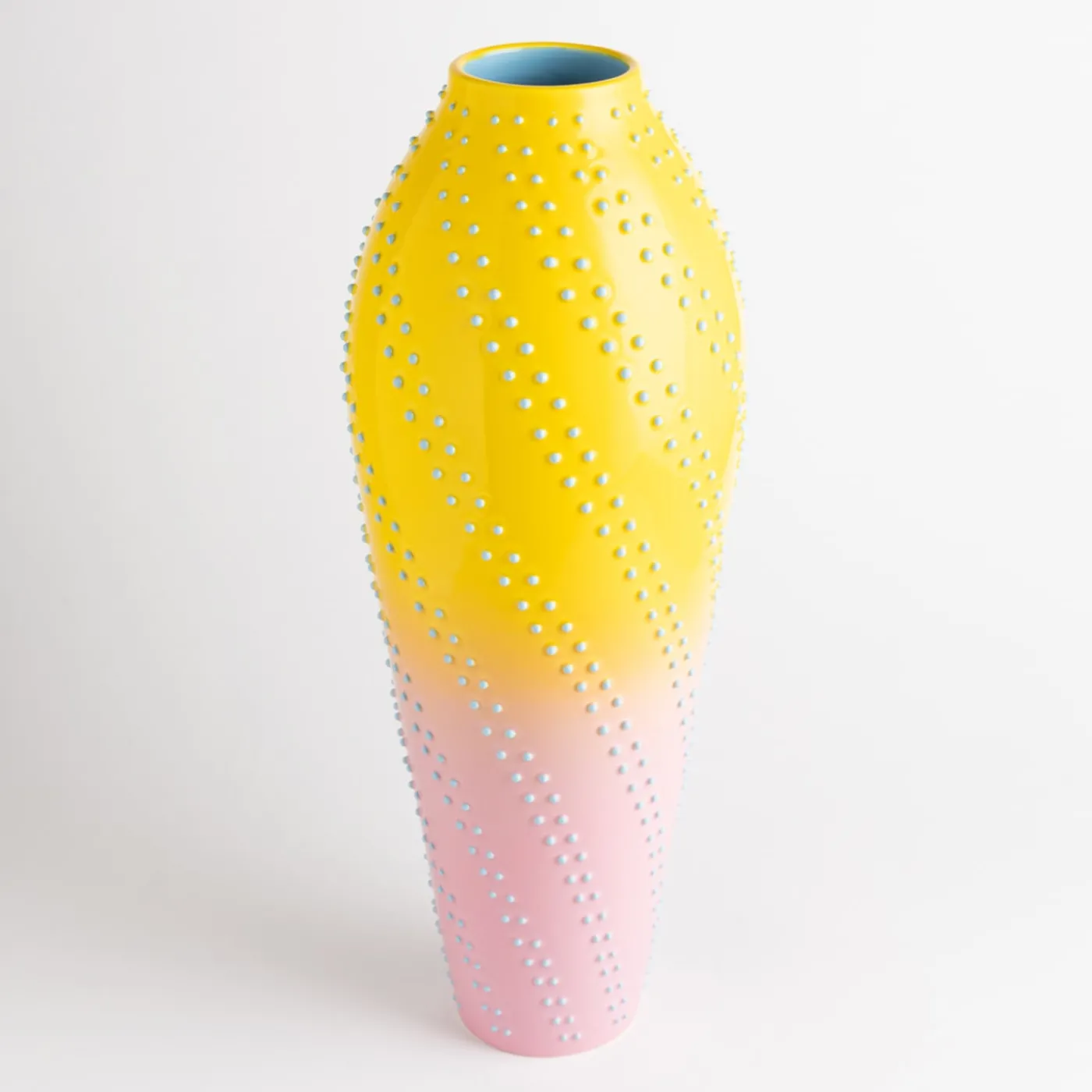 Disegnato da Adam Nathaniel Furman per la Collezione Riccio di pezzi esclusivi, questo splendido vaso reinterpreta il leitmotiv di Nuoveforme creato per la prima volta da Alvino Bagni negli anni Settanta. Interamente lavorato e decorato a mano, è realizzato in ceramica e presenta un corpo giallo e rosa sfumato, impreziosito da puntini turchesi che riprendono il coperchio, anch’esso proposto in giallo.