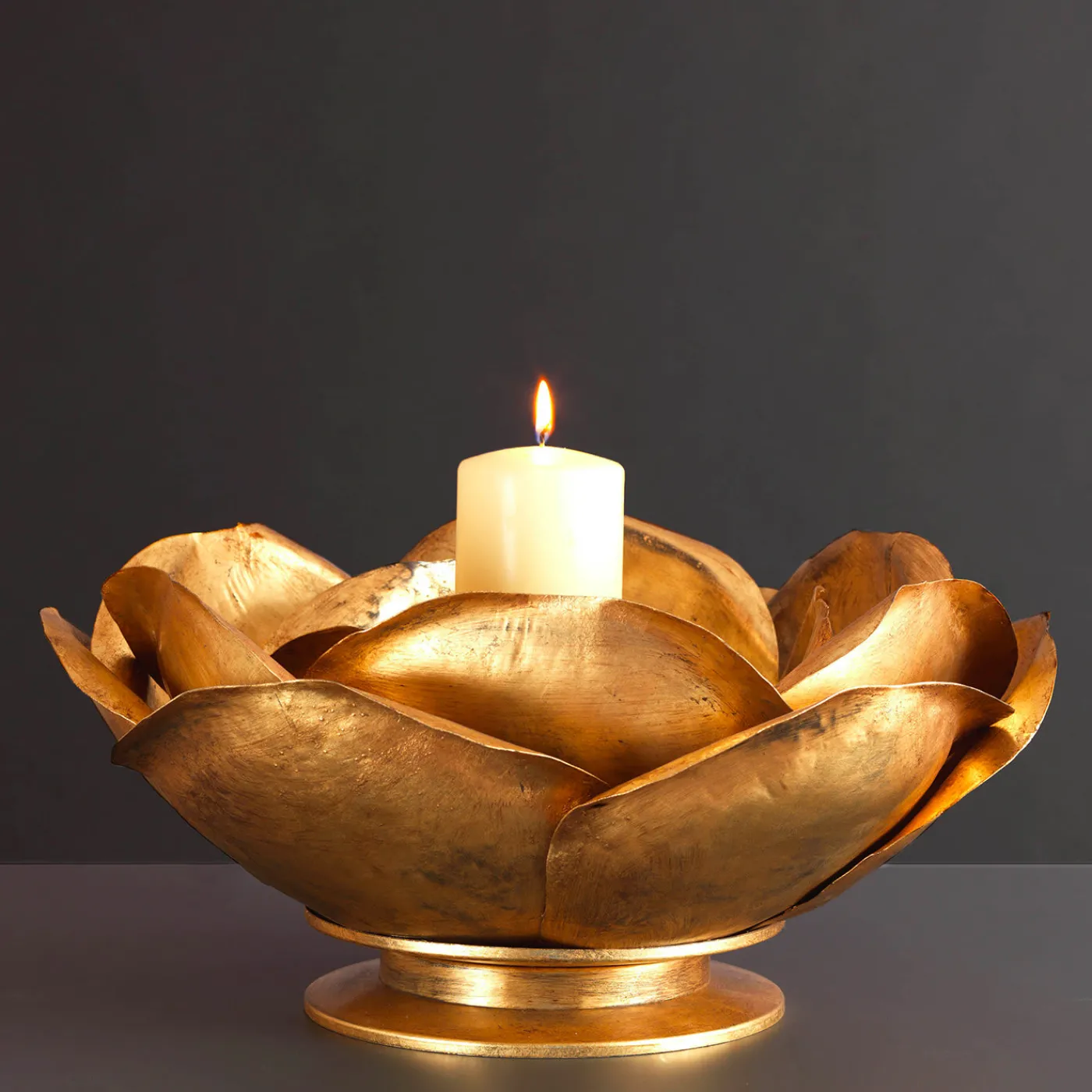 Splendida aggiunta a un interno elegante, questo portacandele è realizzato con lastre di ferro da maestri artigiani che hanno ricreato la delicata forma di una rosa che apre i suoi petali alla primavera. Poggiato su una base rotonda, questo affascinante design arricchirà una consolle d’ingresso, una libreria da salotto e un tavolo da pranzo in occasioni speciali, dove la luce delle candele si rifletterà sulla finitura dorata per un accattivante effetto scintillante.