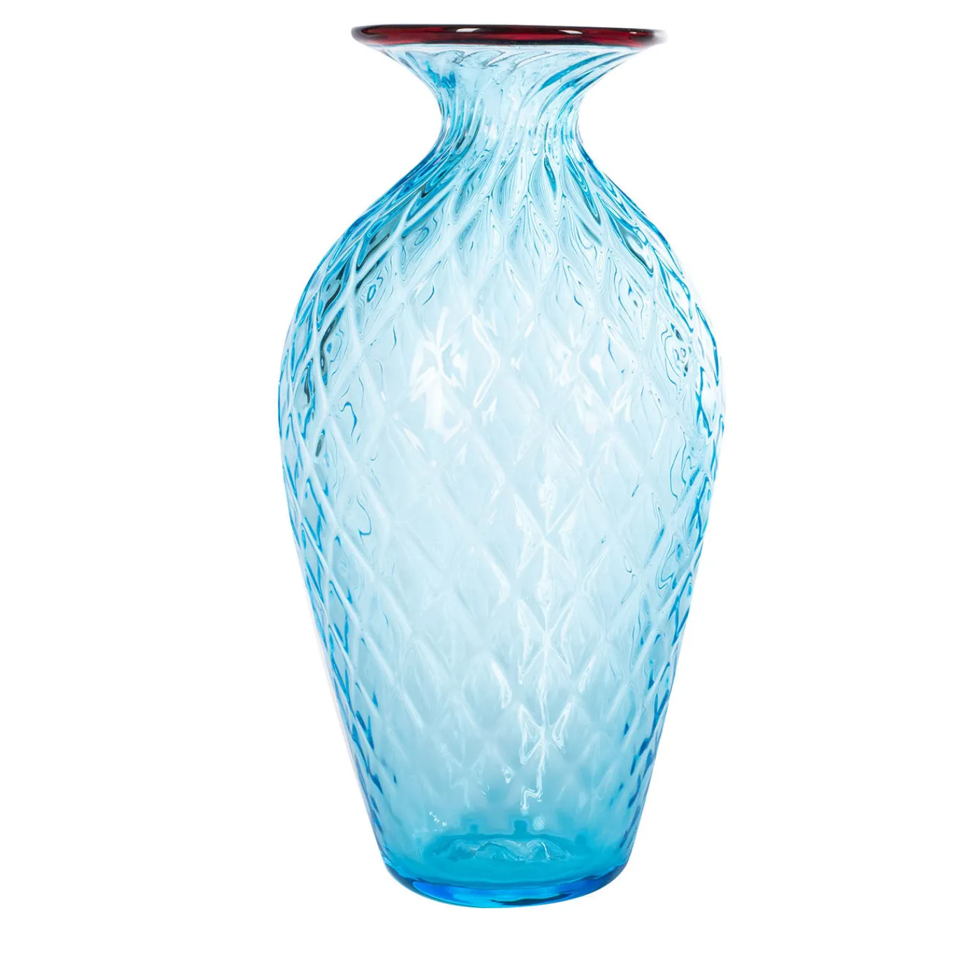 Reso in una fresca tonalità di azzurro che ricorda le acque incontaminate, questo prezioso e rigonfio vaso è stato meticolosamente soffiato a bocca a Murano. Il suo caratteristico motivo a diamante, che conferisce alla struttura e alla vista il suo fascino, è il risultato della tecnica del balloton, un antico metodo artigianale della tradizione vetraria veneziana. Un bordo bordeaux sigilla il pezzo, aggiungendo un piacevole tocco cromatico. Questo pezzo sarà un sublime regalo di nozze.
