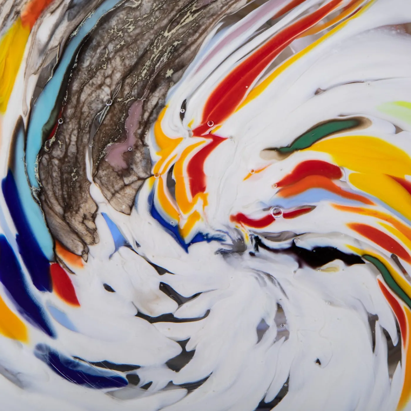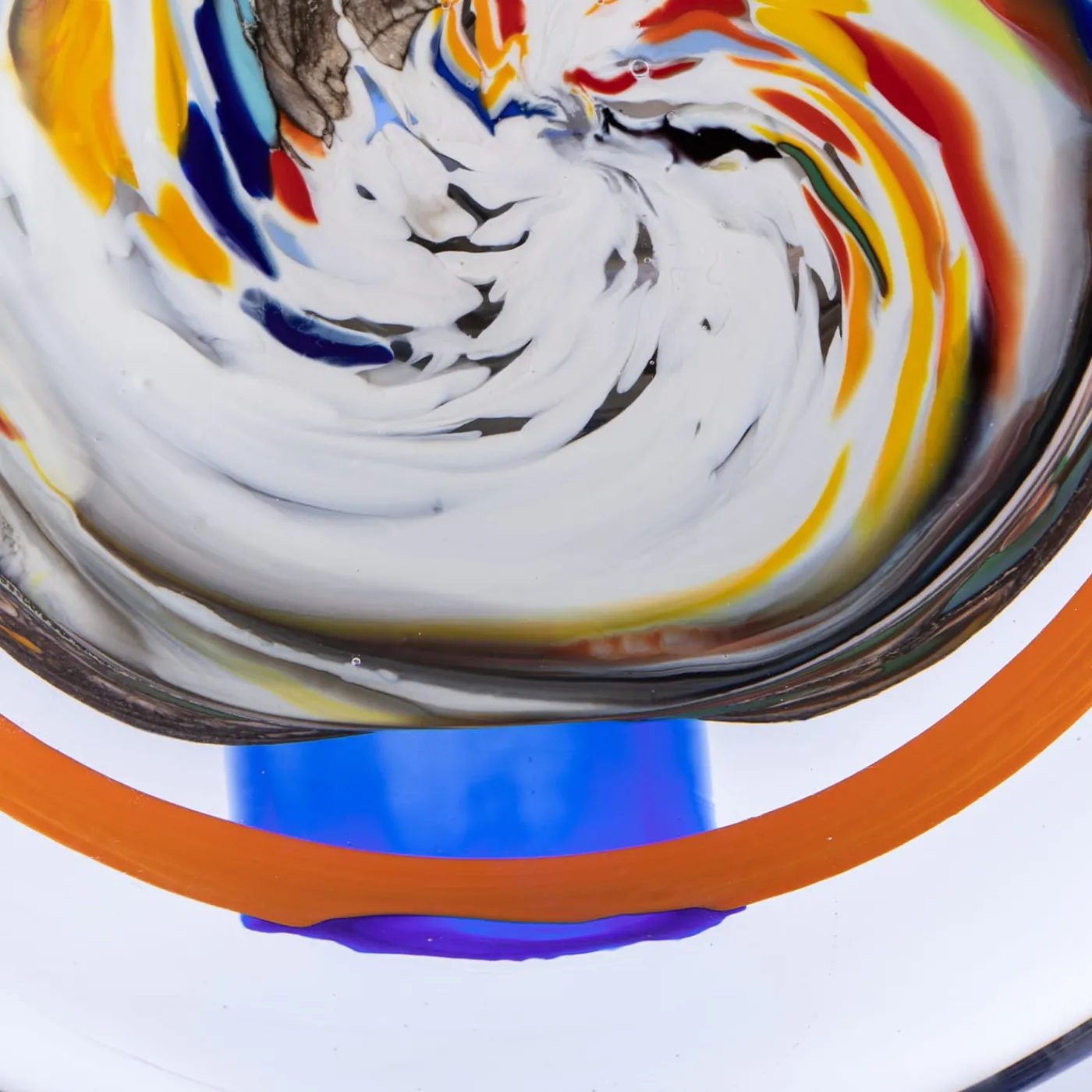 Questa preziosa scultura in vetro catalizzerà l’attenzione ovunque venga collocata, colpendo per il suo design astratto e multicolore. Composta da una base nera, simile a una roccia, e da un disco di vetro trasparente in cui è incastonato un insieme policromo di elementi in vetro, è abilmente realizzata a mano da maestri vetrai veneziani con la tecnica del “sommerso”. Realizzato nel febbraio 2021, viene fornito con un certificato di autenticità.