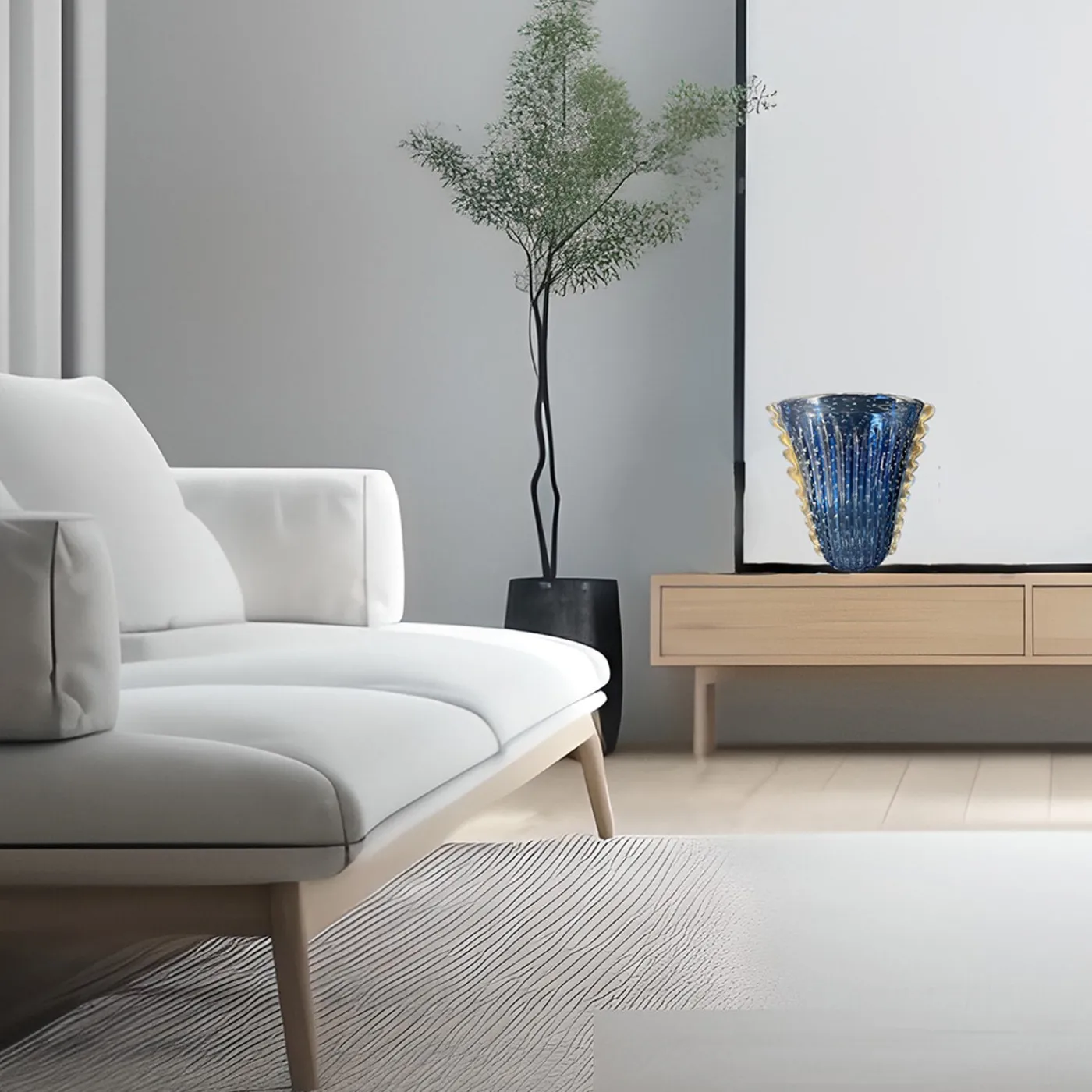 Autentica opera d’arte in pregiato vetro di Murano, questo vaso blu navy emana un fascino senza tempo. Caratterizzato da una texture a balze e da bolle d’aria intrappolate all’interno – ottenute con la tecnica del “balloton” sommerso – il suo impatto decorativo è massimizzato dalla presenza di particelle d’oro 24 carati e da applicazioni ondulate in vetro trasparente ottenute con la tecnica dell'”incalmo”. L’acquisto è accompagnato da un certificato di originalità.