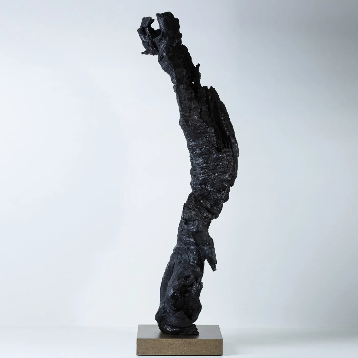 Questa sublime scultura, ricavata da un pezzo di legno di castagno invecchiato dalle intemperie, celebra la bellezza autentica e singolare delle forme disegnate dalla natura. I suoi contorni irripetibili, i suoi vortici e le sue fessure attirano lo sguardo sul suo movimento fluido, che conferisce a questa scultura il suo inconfondibile fascino contemplativo. Una base in legno su ruote, nascosta da una struttura in ottone brunito e martellato, completa il design.