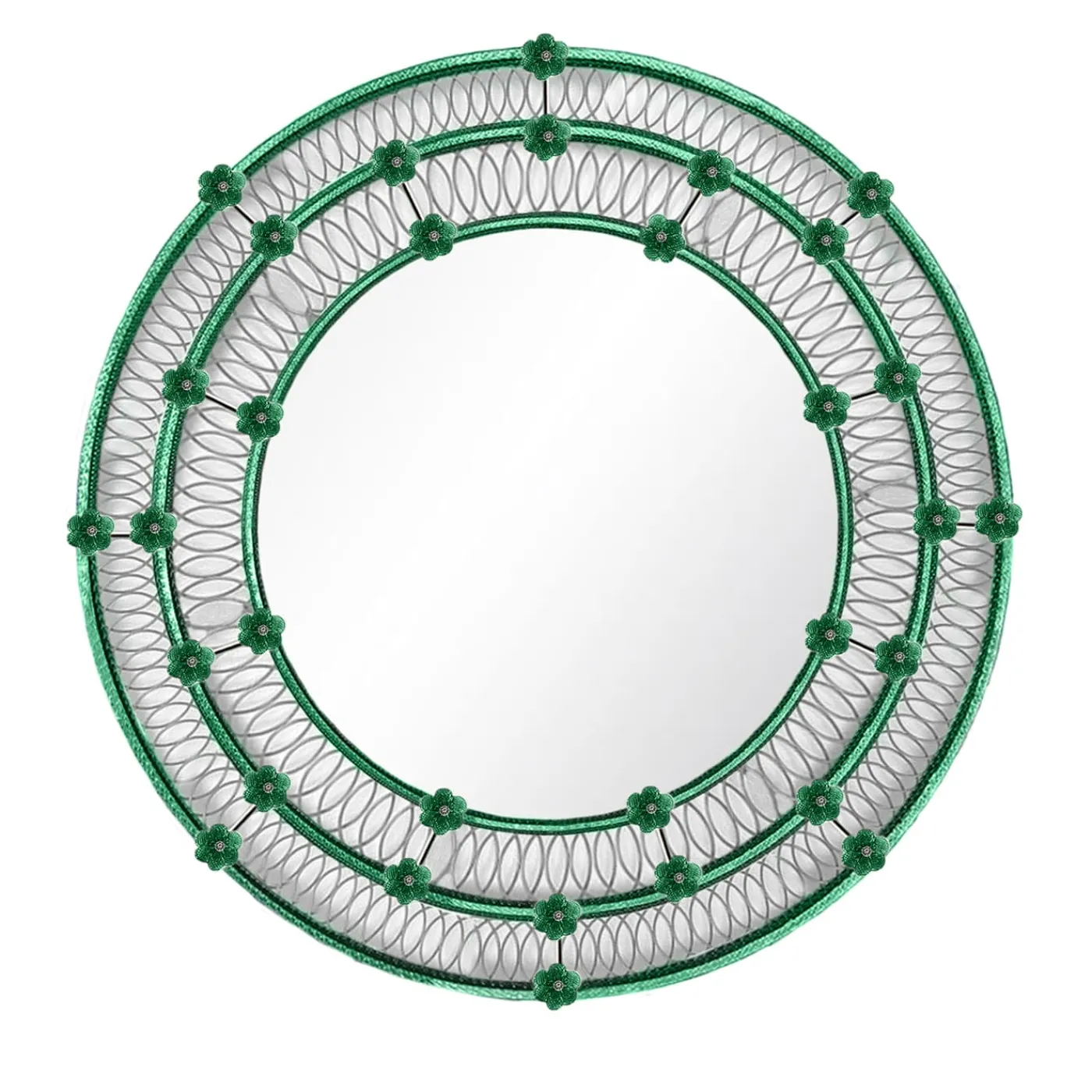 Romantico e opulento, questo specchio rotondo è un’ode alla maestria veneziana nella lavorazione del vetro, che sarà al centro dell’attenzione in raffinati interni classici o moderni. Realizzata in pregiato vetro di Murano, la cornice è composta da anelli verdi concentrici che delineano fasce di vetro trasparente contraddistinte da un ipnotizzante motivo a mandorla, frutto di un paziente processo di incisione manuale. Piccoli fiori verdi arricchiscono la cornice con un pizzico di femminilità.