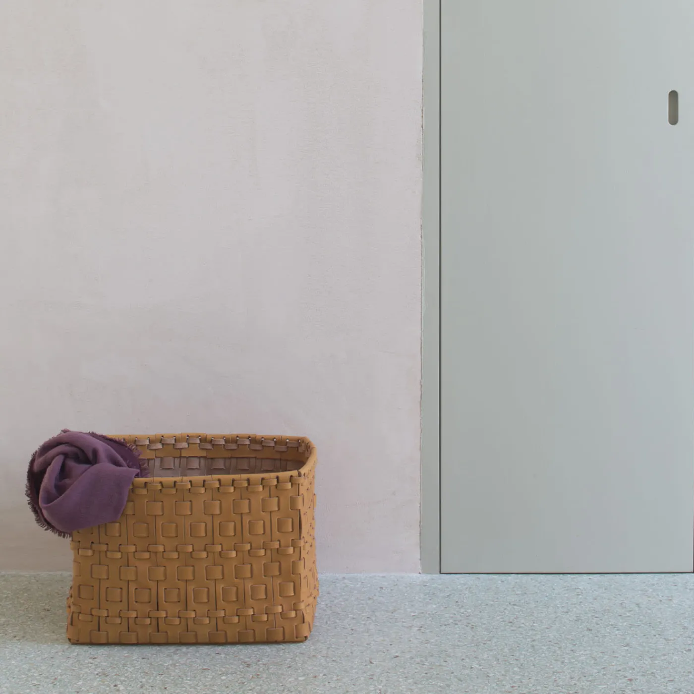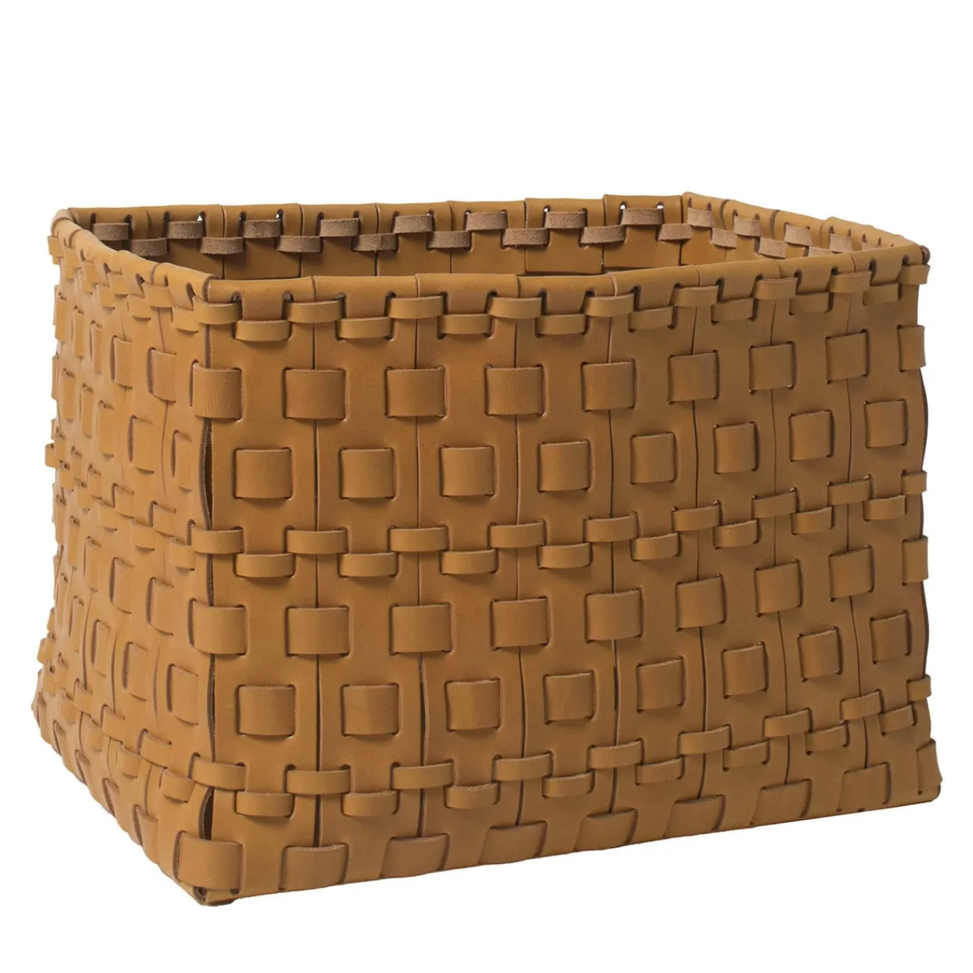 La predilezione contemporanea per le linee semplici incontra il fascino senza tempo delle tecniche artigianali di lavorazione della pelle in questo superbo cestino dal taglio rettangolare. Di dimensioni assortite ma proposte in una tinta unita ocra, le molteplici strisce di pelle sono meticolosamente combinate in uno spago di eccezionale fascino testuale e visivo. Sono disponibili più varianti di colore e forme diverse; per maggiori dettagli, contattare il Concierge.