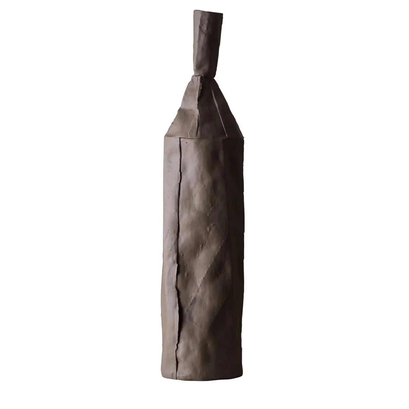 La ricchezza dei dettagli e la forte personalità rendono questa scultura adatta agli interni contemporanei. È realizzata interamente a mano in argilla di carta e presenta una superficie liscia di colore marrone opaco. La silhouette presenta un equilibrio asimmetrico in prossimità della bocca, evocando un’elegante qualità architettonica nella geometria delle sue linee. La sua texture unica è ottenuta con un lungo e complesso processo in cui la paper-clay (ceramica arricchita con polpa di carta) viene modellata e cotta per ottenere un aspetto delicato, quasi fragile. Ogni creazione di Paola Paronetto è unica. Lievi variazioni di forma, colore e dimensione sono da considerarsi garanzia di autenticità e valore. Sono rifiniti con smalti satinati atossici. Anche se molto raramente, è possibile che si verifichino perdite dopo una lunga esposizione all’acqua. È quindi consigliabile testarne la resistenza all’acqua prima di utilizzarli su superfici delicate. Non devono essere utilizzati come utensili da pranzo. I pezzi bianchi possono essere lavati con acqua o prodotti igienizzanti, mentre i pezzi colorati devono essere trattati con maggiore delicatezza e puliti con uno spolverino di piume o un panno morbido, asciutto o inumidito molto leggermente con acqua.