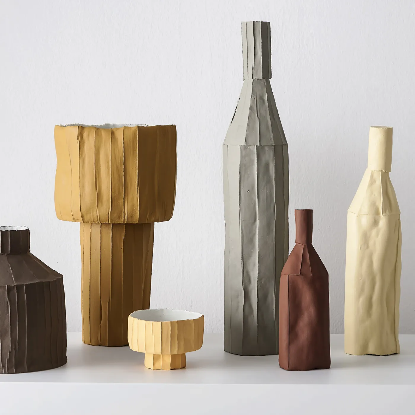 Dalla Collezione Cartocci, la texture distintiva di questa scultura è ottenuta grazie al materiale che la ceramista Paola Paronetto ha scelto per trasformare forme familiari in oggetti scultorei. Utilizzando la paper clay, una miscela di argilla e fibre naturali, questa scultura a forma di bottiglia vanta una leggerezza che viene esaltata dalla sua forma semplice con una finitura liscia di colore marrone. Esposta su una consolle o una libreria, da sola o disposta con altri pezzi di colore e finitura contrastanti, questa scultura farà la sua figura in qualsiasi arredamento. Ogni creazione di Paola Paronetto è unica. Lievi variazioni di forma, colore e dimensione sono da considerarsi una garanzia di autenticità e valore. Sono rifiniti con smalti satinati atossici. Anche se molto raramente, è possibile che si verifichino perdite dopo una lunga esposizione all’acqua. È quindi consigliabile testarne la resistenza all’acqua prima di utilizzarli su superfici delicate. Non devono essere utilizzati come utensili da pranzo. I pezzi bianchi possono essere lavati con acqua o prodotti igienizzanti, mentre i pezzi colorati devono essere trattati con maggiore delicatezza e puliti con uno spolverino di piume o un panno morbido, asciutto o inumidito molto leggermente con acqua.