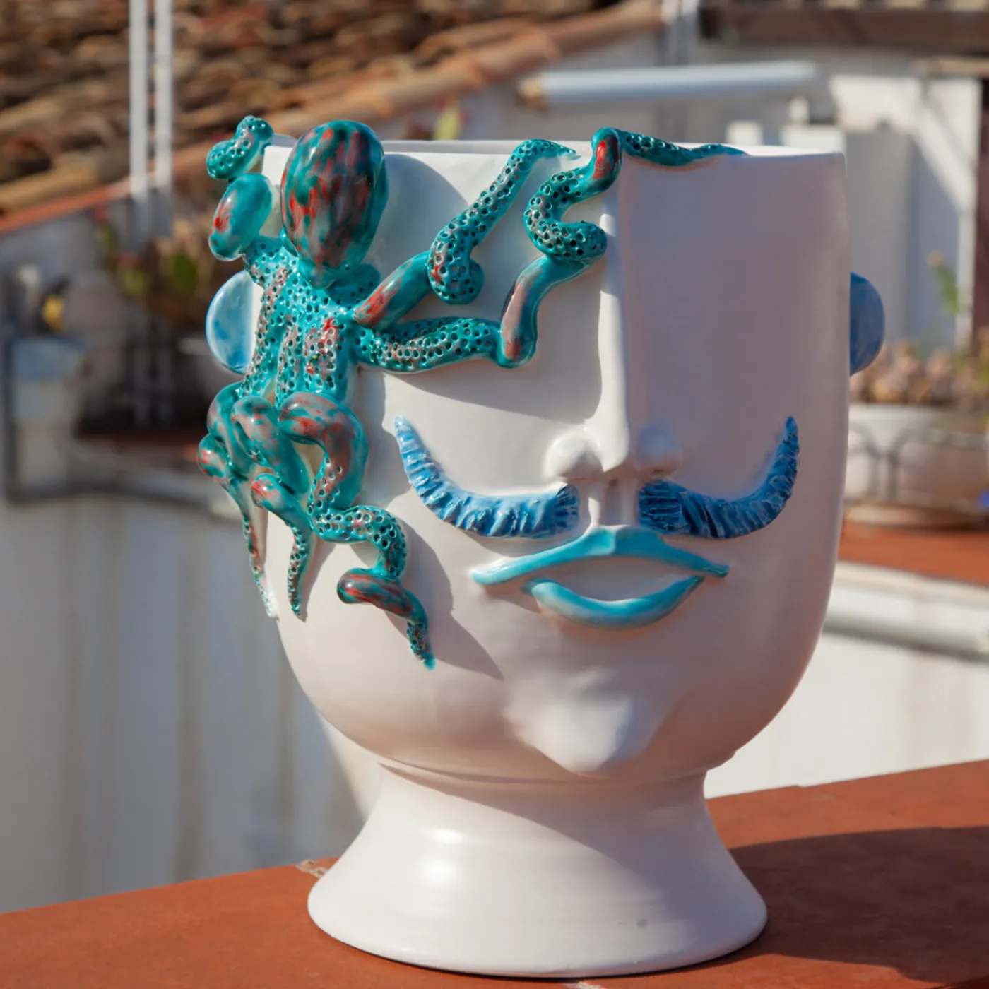 Un pezzo ideale per accentuare gli arredi costieri, questo sofisticato design in fine ceramica bianca opaca è contemporaneamente un recipiente e una testa antropomorfa semplicemente decorativa. Mostra un volto maschile – ispirato a Salvo, un venditore ambulante di polpi (“u pulparu” in dialetto siciliano) – con un polpo in 3D che ne adorna il fianco fino al bordo. Gli smalti cristallini nei toni dell’azzurro, del turchese e del rosso sono utilizzati per accentuare i baffi, le labbra e il polpo minuziosamente dettagliato.