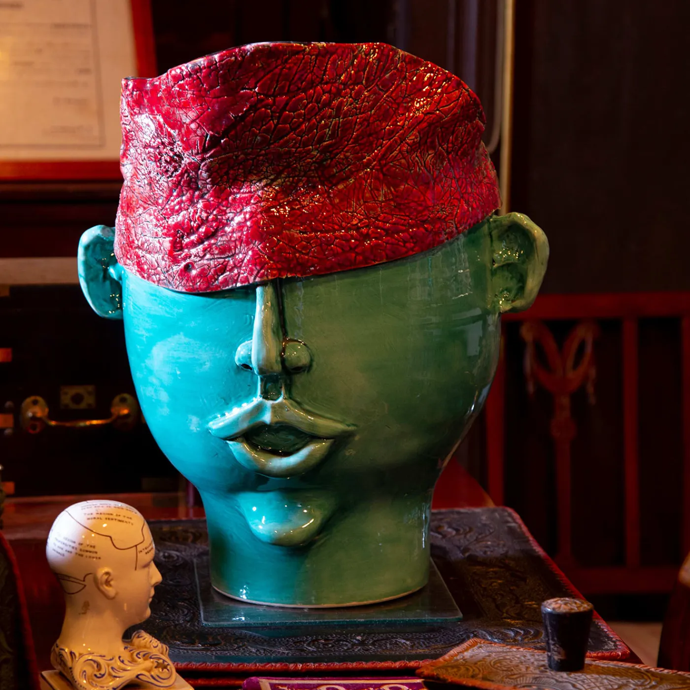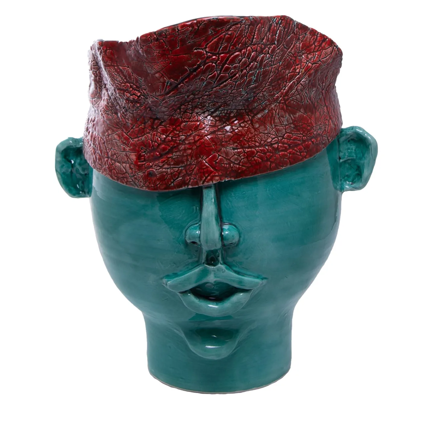 Testa in ceramica fatta a mano, in argilla bianca e cristallina colorata. Può contenere acqua ed essere utilizzata come decorazione o come portapiante o portafiori.