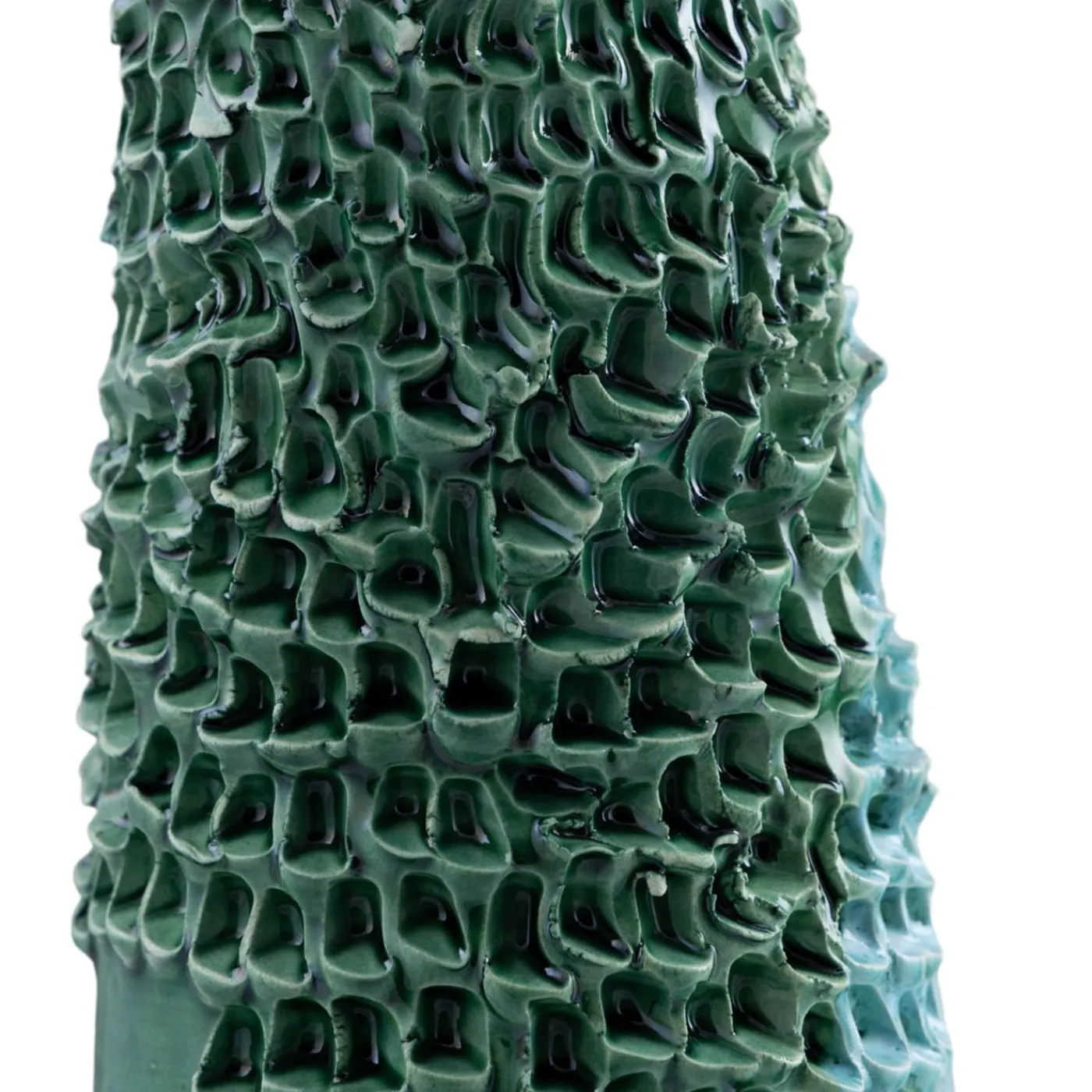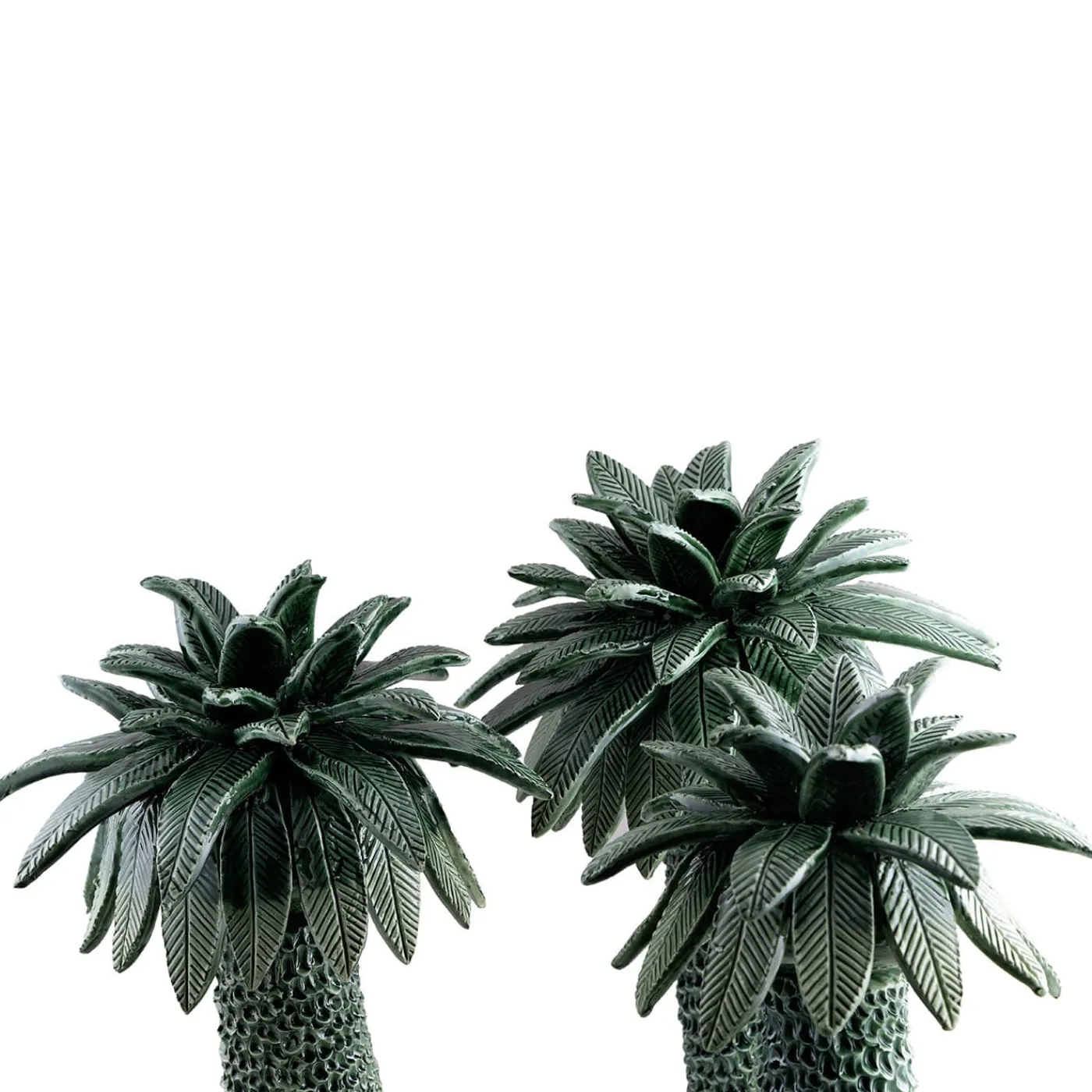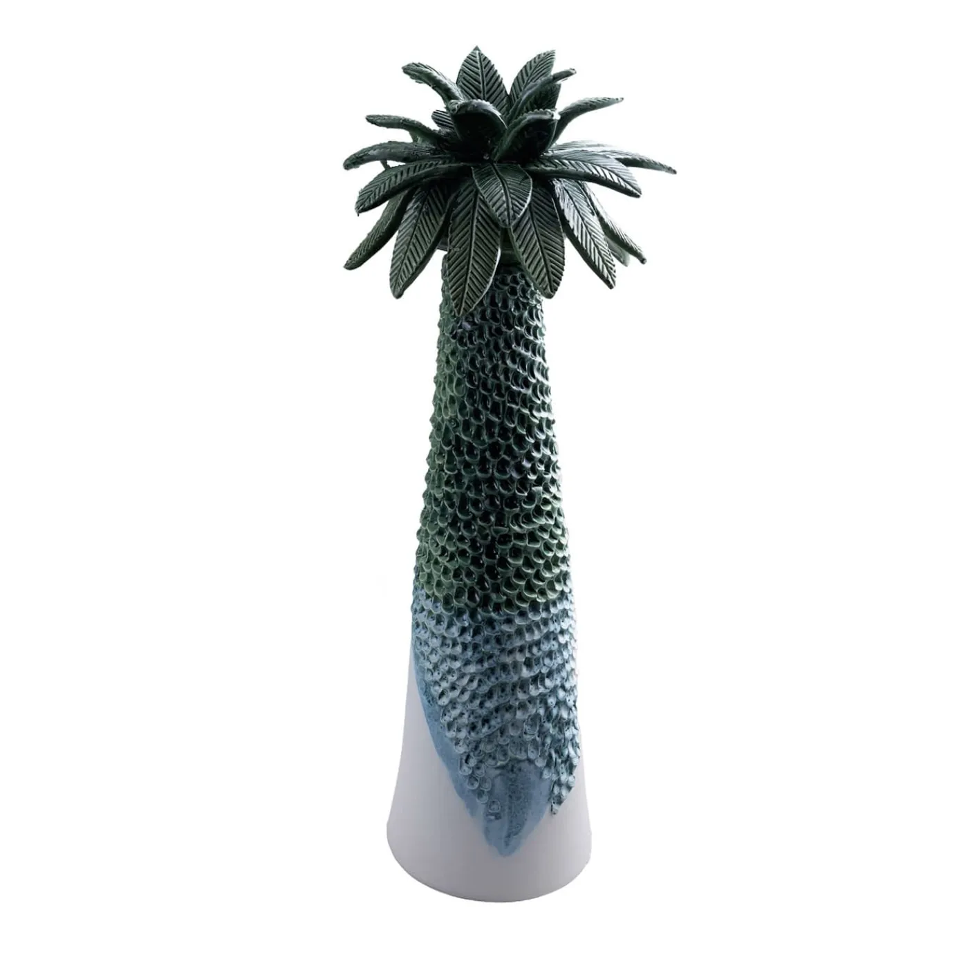 Il grande vaso Palma è composto da due splendidi pezzi. La parte inferiore presenta un vaso intricato e inciso con colori cristallini vivaci e una finitura a smalto bianco opaco. La parte superiore è modellata ad arte come foglie di palma, aggiungendo un tocco di naturalezza ed eleganza. Un mix perfetto di texture, colore e design per valorizzare qualsiasi interno.