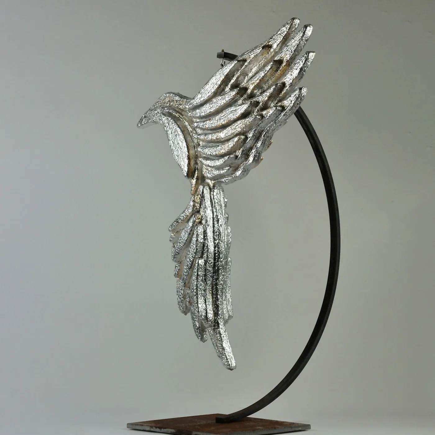 Un’ode alla libertà, questa scultura mostra un uccello sinuoso catturato poco prima di sbattere le ali. Una preziosa foglia d’argento ricopre l’intero corpo dell’animale, conferendogli una straordinaria qualità scintillante ed esaltando la texture ottenuta con l’applicazione del gesso a rilievo. Lo stelo di sostegno semicircolare che si estende da una base quadrata – entrambi in ferro grezzo – sottolinea il suo crudo dinamismo.