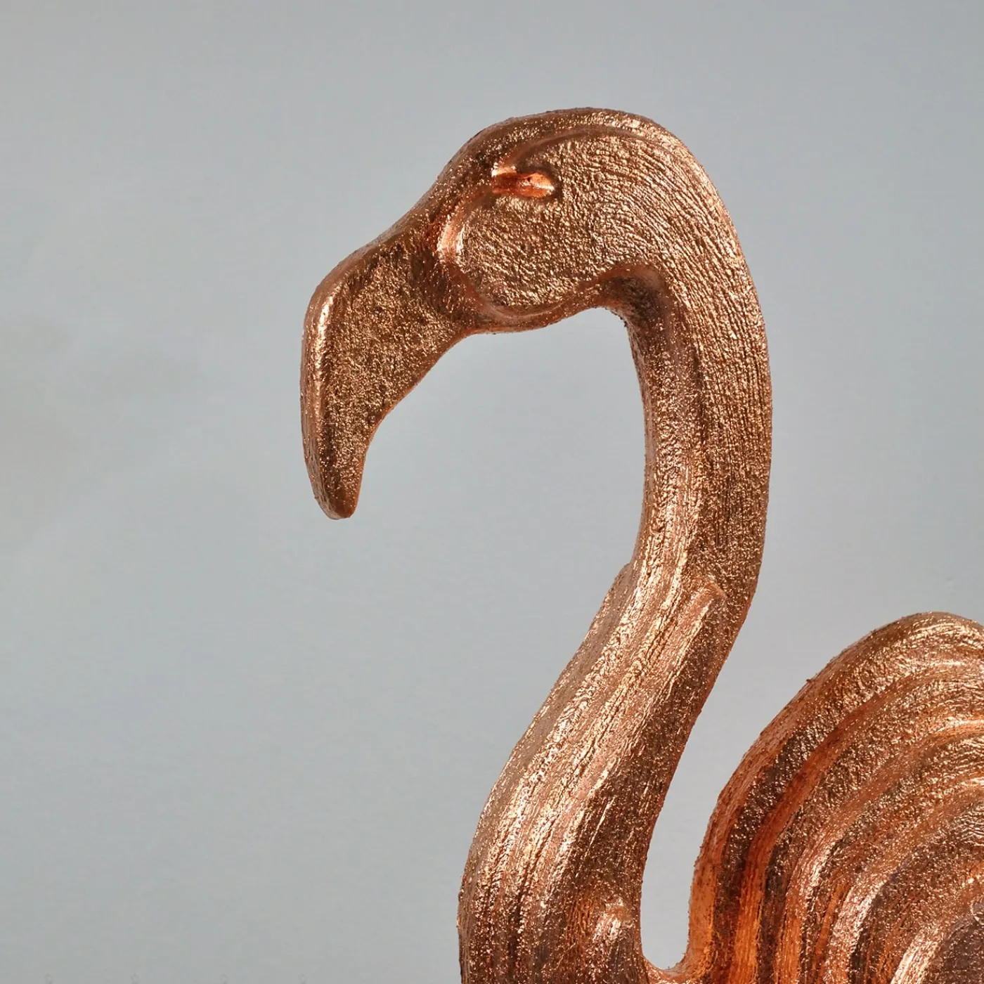 I fenicotteri e la loro poetica fragilità hanno ispirato questa splendida scultura zoomorfa in poliuretano estruso, il cui gambo affusolato rappresenta le zampe extra-sottili e allungate tipiche degli uccelli. Montato su una base in ferro grezzo, il corpo del fenicottero è rifinito con un’applicazione di gesso a rilievo e preziose foglie di rame per un suggestivo gioco di riflessi che risulta enfatizzato quando il pezzo è colpito dalla luce.