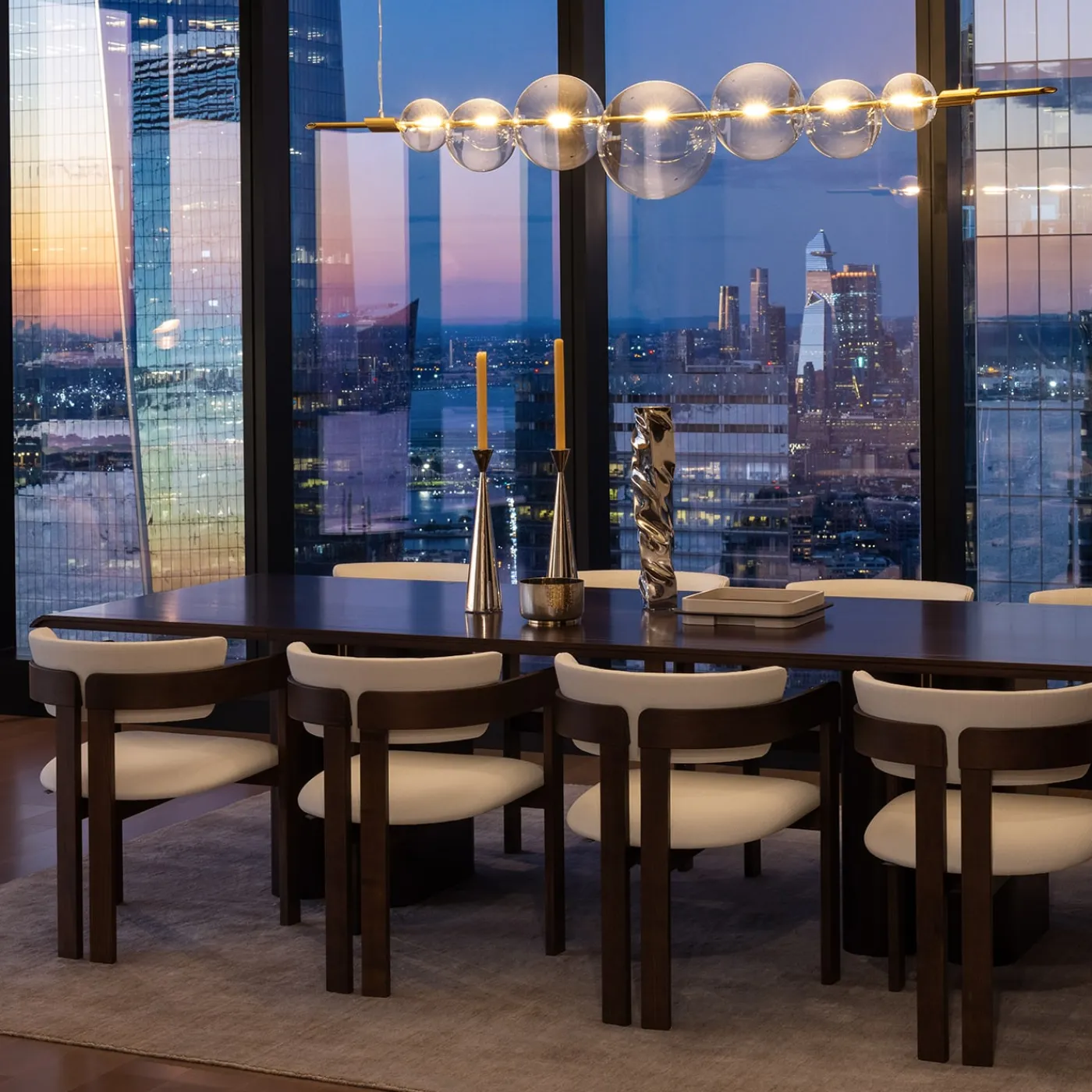 Utilizzato per abbellire un tavolo da pranzo moderno o una consolle d’ingresso, questo sorprendente candeliere porterà il fascino contemporaneo in qualsiasi interno. La silhouette elegante e slanciata evoca una clessidra irregolare, con i due elementi a forma di cono collegati alla sommità, abilmente forgiati a mano in ottone e rifiniti con una placcatura in nichel lucido. Disponibile anche in una misura più piccola, la coppia può essere esposta insieme per un accattivante look alto-basso. Questo pezzo è attualmente in mostra e immediatamente disponibile presso la Galleria Artemest di New York.