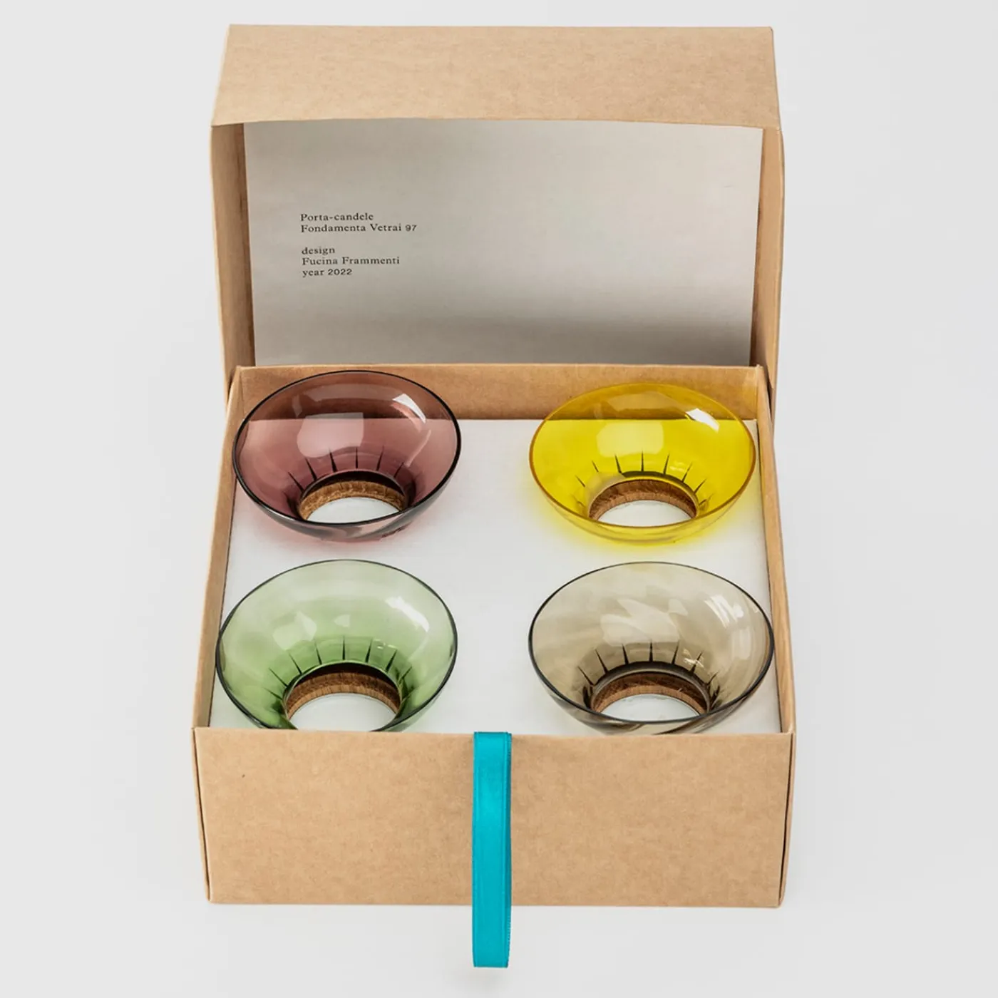 Una raffinata combinazione di materiali che celebrano Venezia caratterizza ciascuno dei quattro portacandele che compongono questo vivace set policromo. Chiamato con il nome dell’indirizzo in cui nacque Vincenzo Zanetti – abate che si dice abbia custodito negli anni i segreti della lavorazione del vetro – il set combina bobeches in vetro di Murano con semplici basi in legno di briccola. Sono incluse quattro tealight.