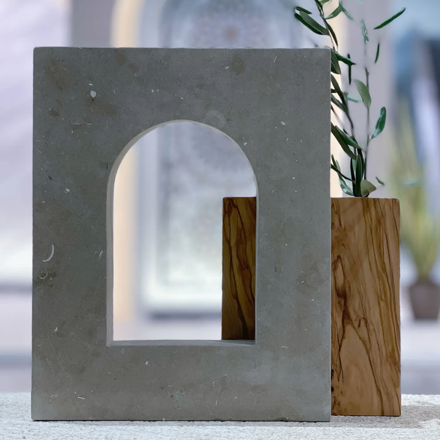 Volumi archetipici che interagiscono in un disegno a incastro caratterizzano questa superba scultura contemporanea. Evocativa di scenari metafisici, è costituita da un blocco di calcare leccese la cui apertura centrale è funzionale ad accogliere il blocco-porta in legno d’ulivo per un intrigante sistema a incastro. L’uso esclusivo di ulivi affetti da Xylella – un patogeno delle piante – rivela l’etica sostenibile alla base del progetto.
