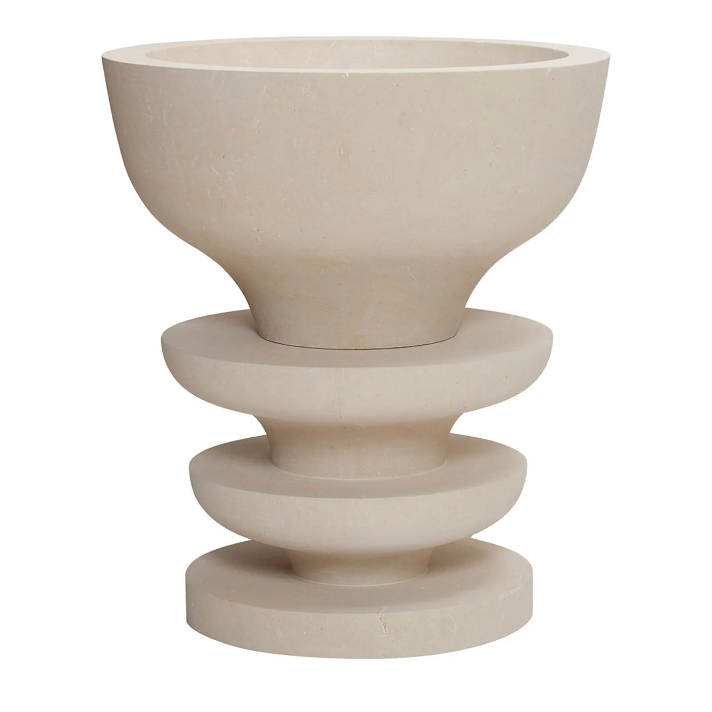 La forma insolita della collezione Ondulation di Matali Crasset nasce da un progetto estratto da un’animazione digitale: un sogno ipnotico in cui si viaggia in un paese immaginario, arrivando in una città dove le torri ondeggiano dolcemente per rasserenare gli abitanti. La pietra naturale Pimar prende la forma di una serie di strutture simili alle torri ondeggianti. Il risultato è una collezione di oggetti composta da un tavolo, uno sgabello e un vaso, interamente realizzati in pietra attraverso la tecnica della tornitura.