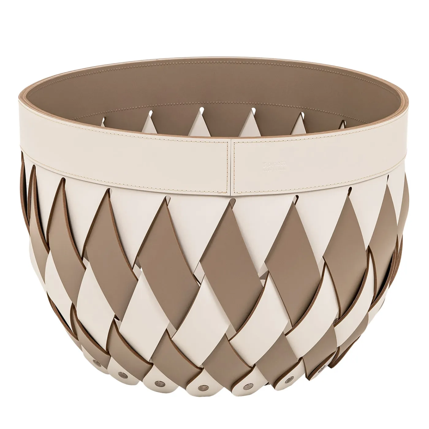Abilmente realizzato a mano in pelle di Antibes intrecciata, adatto sia per l’interno che per l’esterno, questo stupendo cestino beige e tortora è un design ideale per contenere asciugamani o riviste in un ambiente raffinato. Dotato di chiodi di rivestimento che ne esaltano il carattere artigianale, è disponibile in altre dimensioni e colori. Per ulteriori informazioni, consultare il catalogo Artemest.