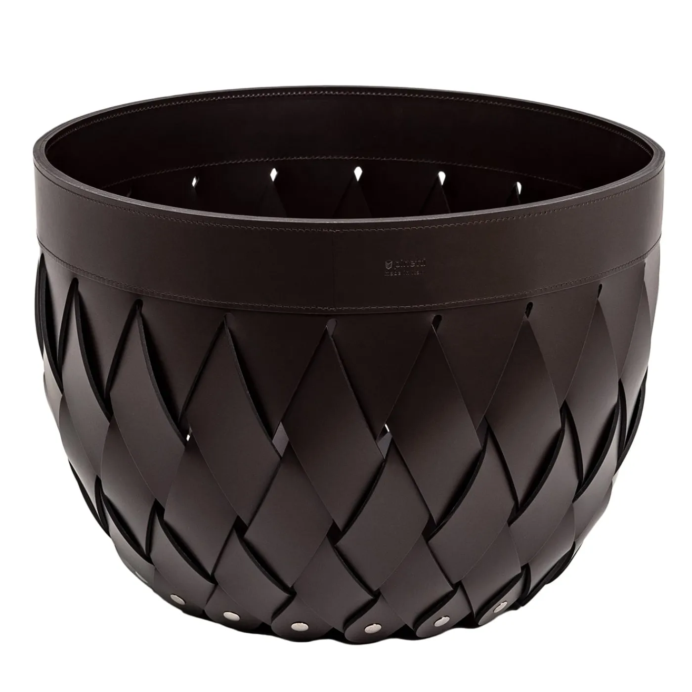 Ideale per contenere asciugamani o riviste in un ambiente raffinato, questo cestino è abilmente realizzato a mano in pelle di Antibes intrecciata color marrone caffè, adatto sia per interni che per esterni. Arricchito da chiodi da tappezzeria che ne esaltano il carattere artigianale, è disponibile in altre dimensioni e colori. Per le opzioni, consultare il catalogo Artemest.