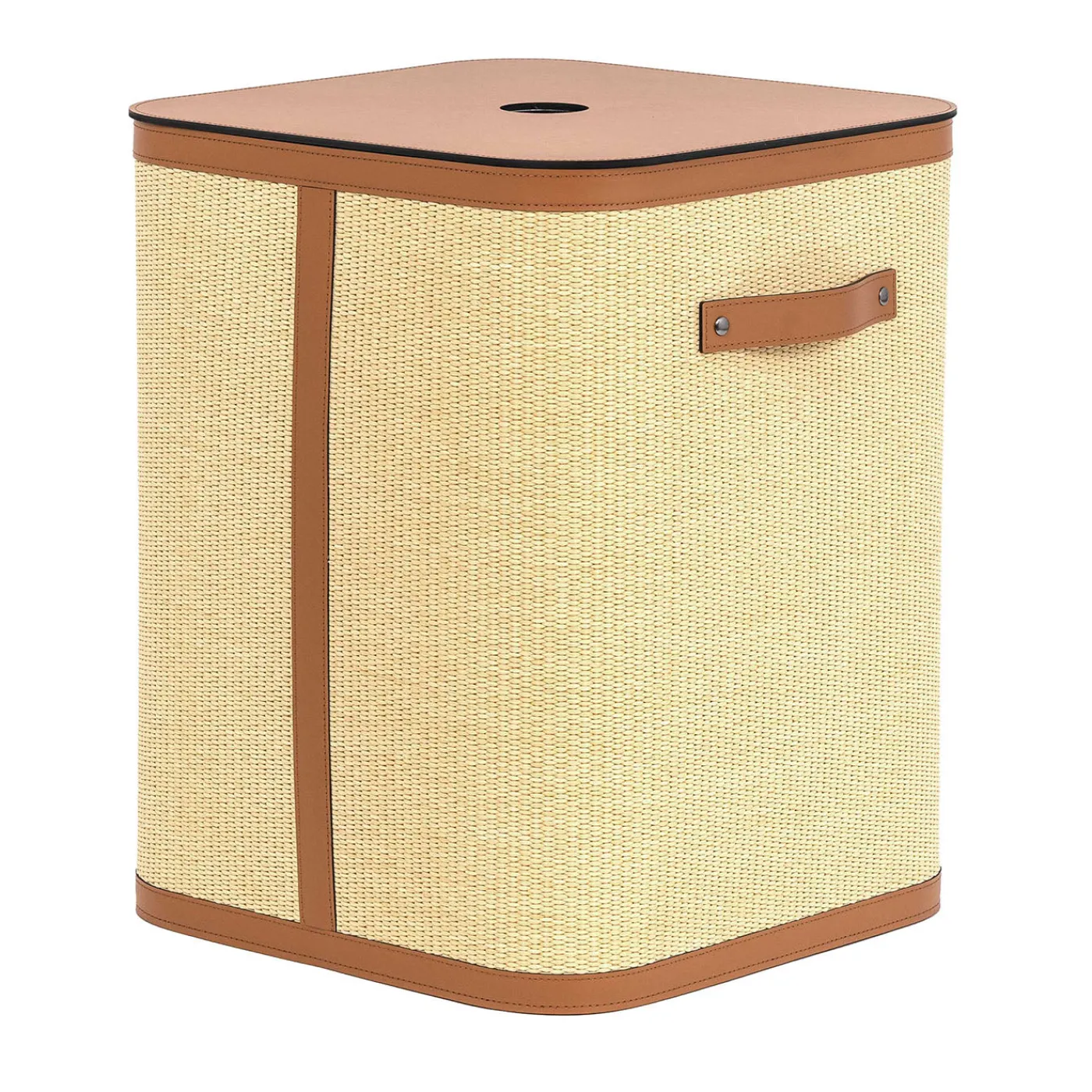 Un capiente cesto da bucato quadrato della collezione Pinetti 2025, caratterizzato da una raffinata combinazione di pelle rigenerata e pregiato rivestimento in paglia. Progettato per l’ambiente bagno, è un contenitore elegante e funzionale, con una silhouette strutturata e un manico pratico per facilitarne il trasporto.