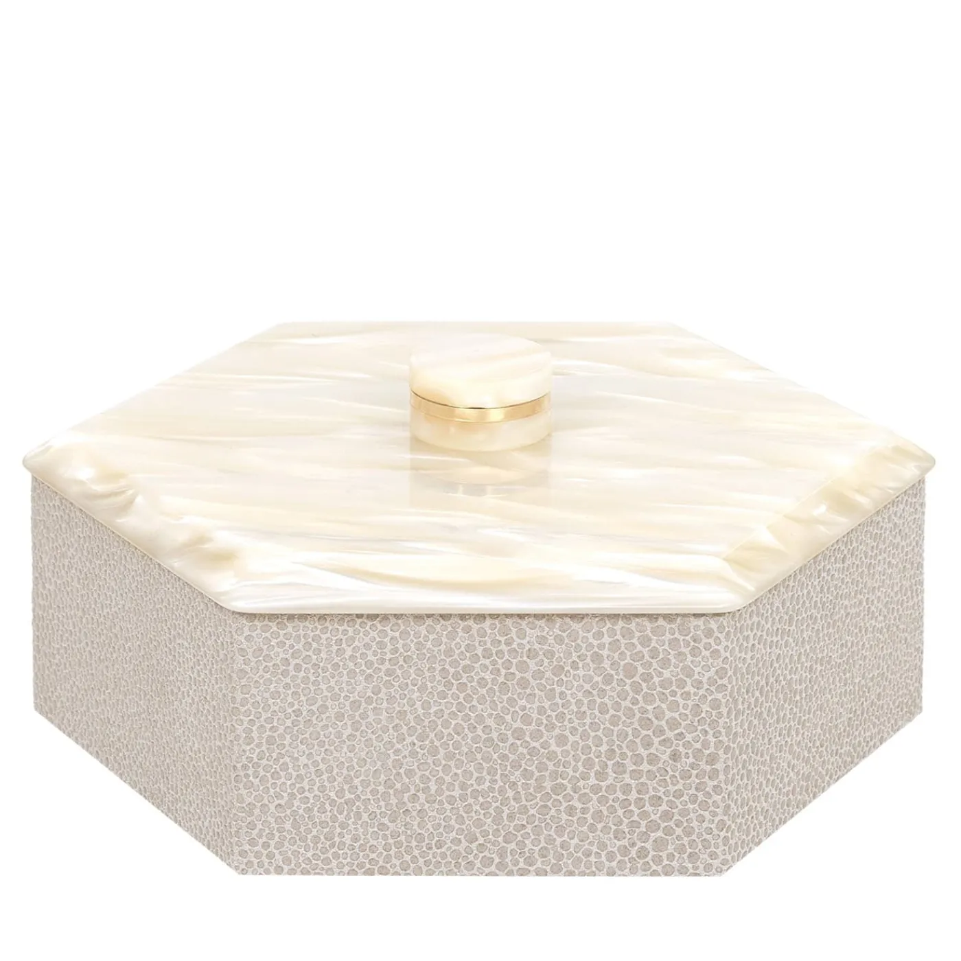 Questo raffinato design multiuso è realizzato meticolosamente a mano con materiali di prima qualità e sfoggia una forma esagonale sofisticata e senza tempo, disponibile anche in formato rotondo. Realizzato in resina rifinita in tonalità madreperla, il coperchio copre uno stupendo contenitore di piccole dimensioni interamente rivestito in pelle, in una tonalità crema. Per altri modelli della serie Kelly, consultare il catalogo Artemest.