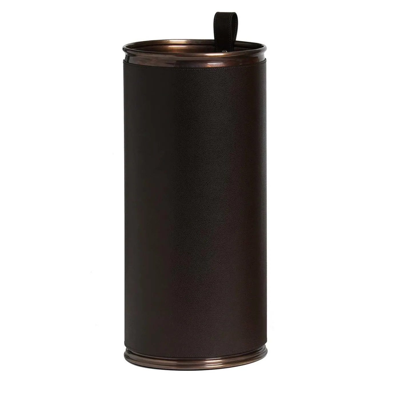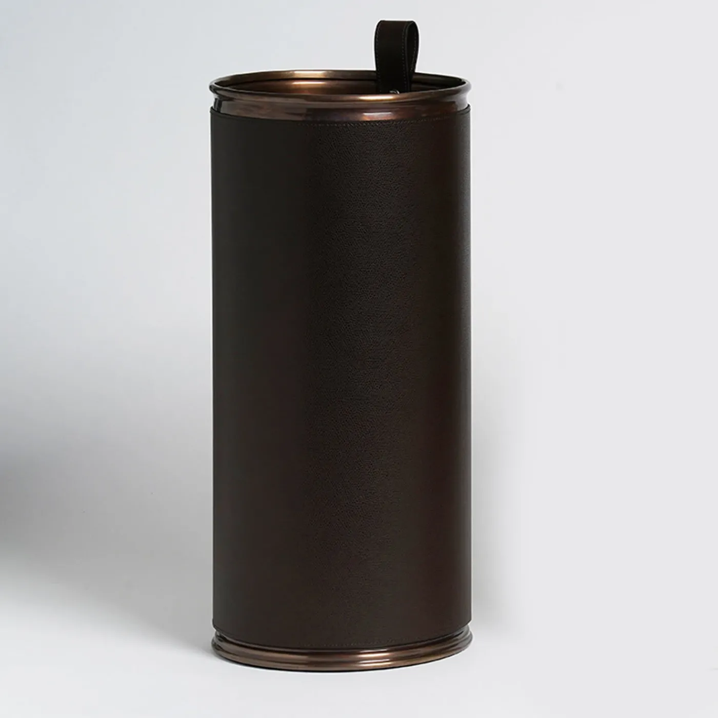 Alto e architettonico, questo eccezionale portaombrelli non passerà inosservato nel foyer di una casa o di un ufficio. La silhouette cilindrica è realizzata in acciaio con finitura brunita e fianchi in pelle marrone; il contrasto testuale tra il corpo caldo e la pelle altamente strutturata eleva la maestria del pezzo. Un passante in pelle all’interno del supporto consente di spostarlo facilmente sia da vuoto che da pieno. L’uso di finiture in metallo e pelle a contrasto crea un’opera d’arte accattivante.