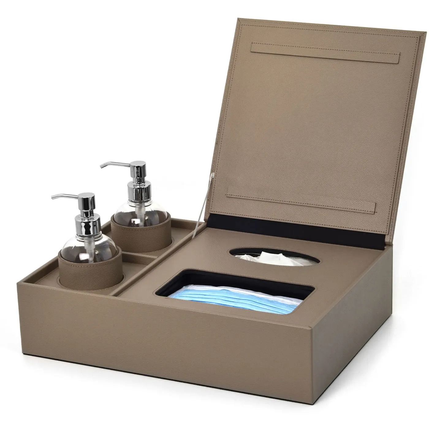 Rivestito in morbida pelle italiana, questo elegante vassoio è una soluzione elegante per interni commerciali e residenziali, progettata per fornire ai vostri ospiti o clienti la disinfezione delle mani e gli accessori per mantenere gli ambienti puliti e igienizzati. Presentato in una versatile tonalità tortora, e disponibile in un’ampia gamma di colori del catalogo Malaga, questo set comprende due flaconi in vetro ricaricabili per il disinfettante per le mani e due scomparti per riporre guanti e maschere monouso sotto il coperchio a cerniera.