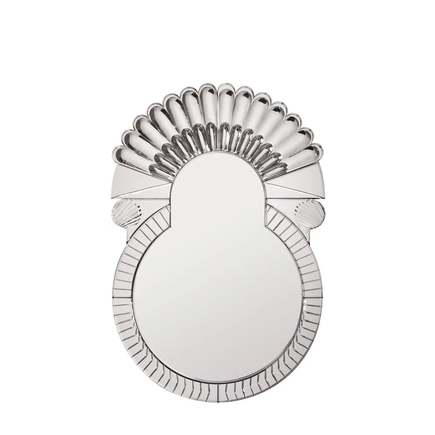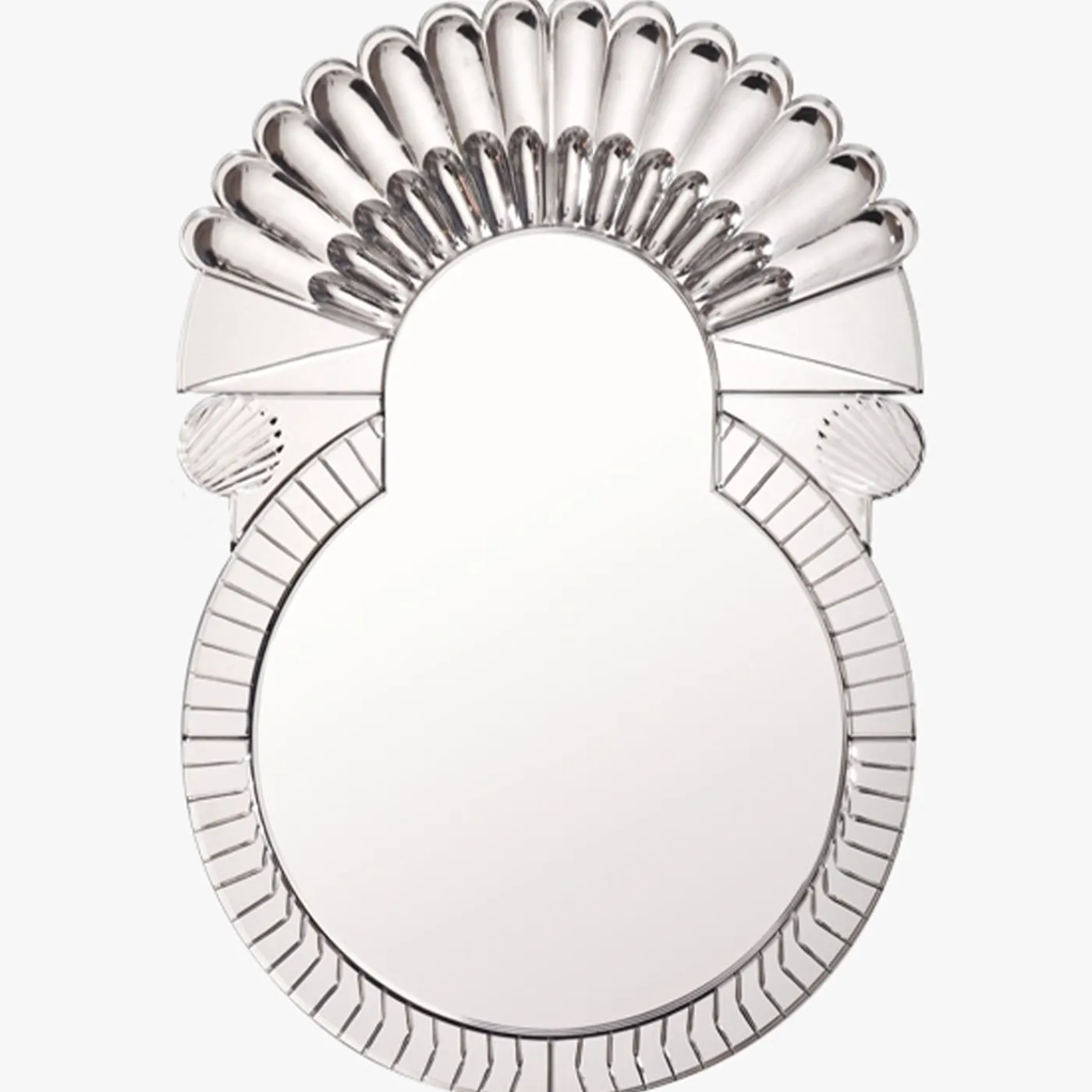 Ispirato all’architetto italiano del XVII secolo Palladio, questo specchio di grande effetto è un pezzo unico che arricchisce l’aspetto di qualsiasi arredamento. La sua superficie è modellata a mano in vetro di Murano per creare una silhouette unica a forma di goccia, ornata nella parte superiore da una serie di complessi elementi decorativi che creano un’illusione ottica di profondità, ulteriormente valorizzata dall’uso di una finitura argentata. Preziosa aggiunta a un ingresso, questa specchiera può anche essere il punto focale di una decorazione da caminetto o essere collocata in una toilette per un tocco di lusso.