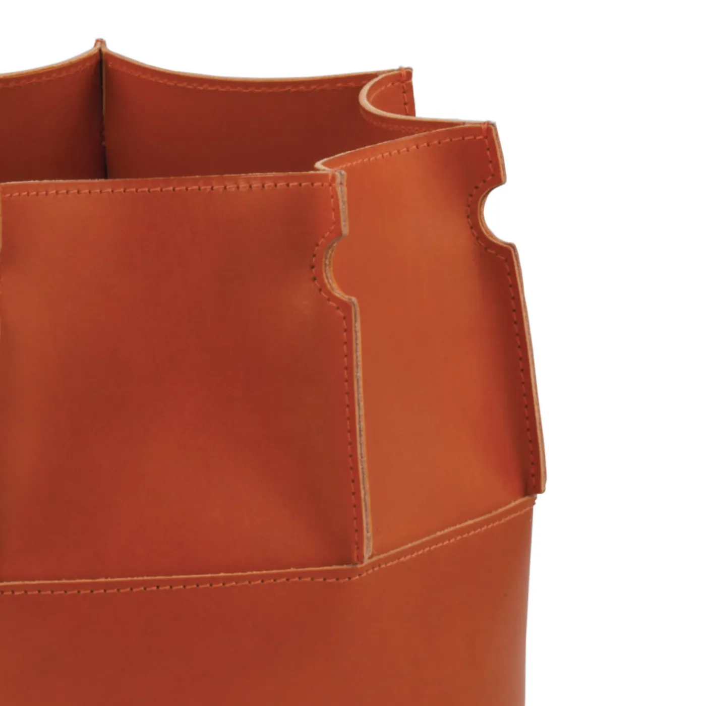 Questo sorprendente cesto portaoggetti è il risultato di una squisita lavorazione artigianale e di un design moderno. È interamente realizzato con la pelle più pregiata, tinta con fibre vegetali in una profonda tonalità di arancione. La base rotonda sostiene un corpo evidenziato da cuciture verticali ornate da tagli semicircolari verso la parte superiore. Un pezzo funzionale di arredamento moderno, questo oggetto diventerà un’aggiunta preziosa a qualsiasi casa e completerà qualsiasi arredamento.