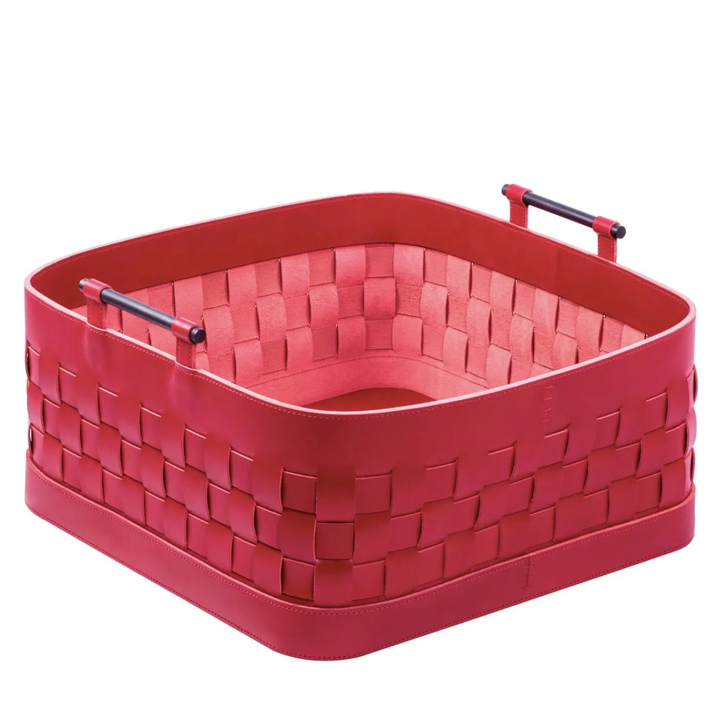 Elegante e vivace, il design di questo cestino attira l’attenzione in un arredamento moderno, aggiungendo un tocco di colore vivace a qualsiasi stanza della casa. Utilizzato per contenere oggetti di uso quotidiano o per esporre oggetti da collezione, questo pezzo può essere esposto da solo o con altri della stessa collezione Ravenna in forme e colori diversi. Questo cestino è composto da strisce di pelle intrecciate e resistenti all’acqua che formano la silhouette quadrata di questo pezzo, con una vivace tonalità rossa, che contrasta legalmente con il bronzo spazzolato dei manici.
