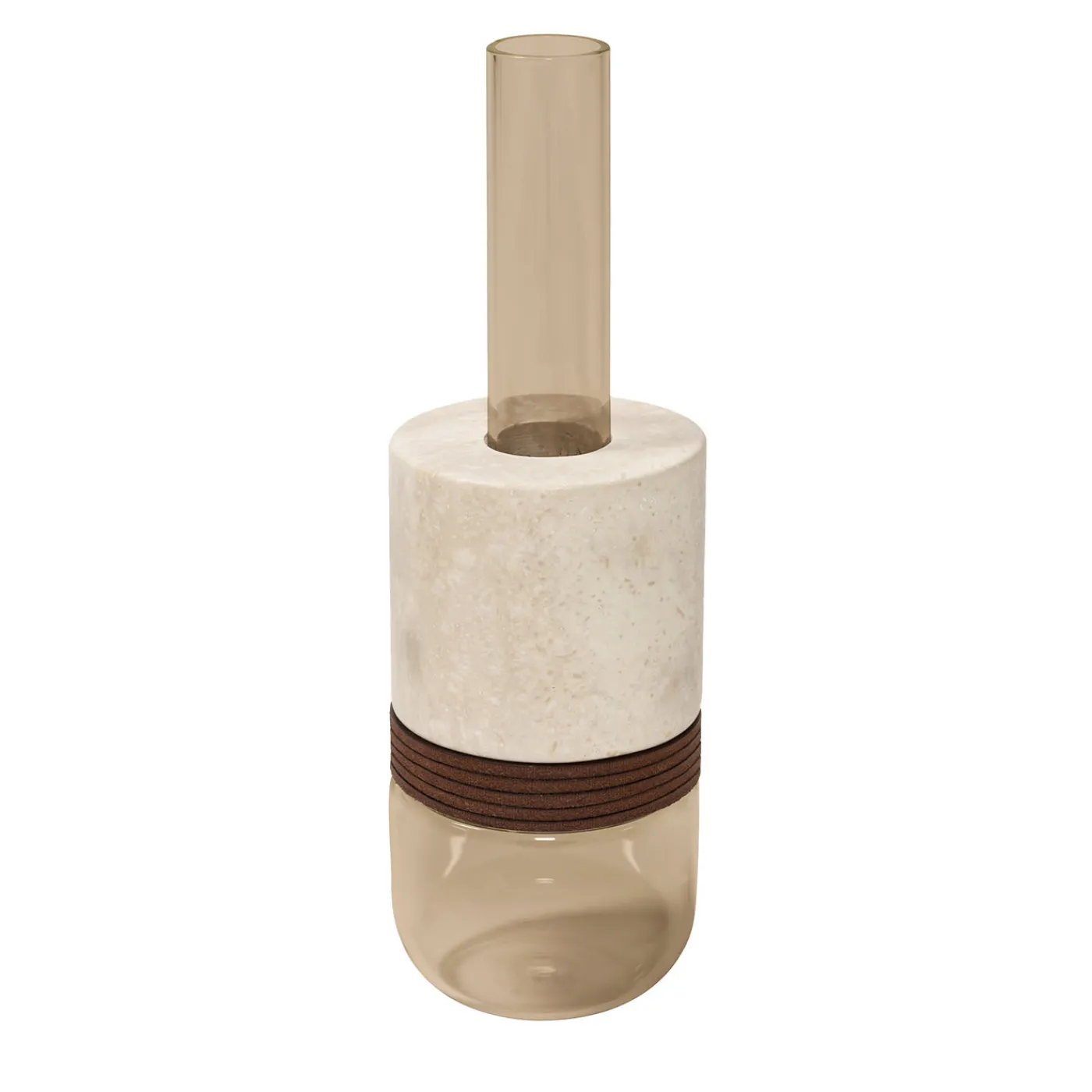 Forme, texture e materiali diversi si fondono in modo unico in un pezzo eclettico ma visivamente equilibrato di audace raffinatezza, il vaso Cliff di Simone Fanciullacci. Con una struttura elegante in vetro soffiato color ambra, è arricchito da un robusto elemento in travertino che racchiude parte del collo sottile e cilindrico, impreziosito da sottili strisce di cuoio.