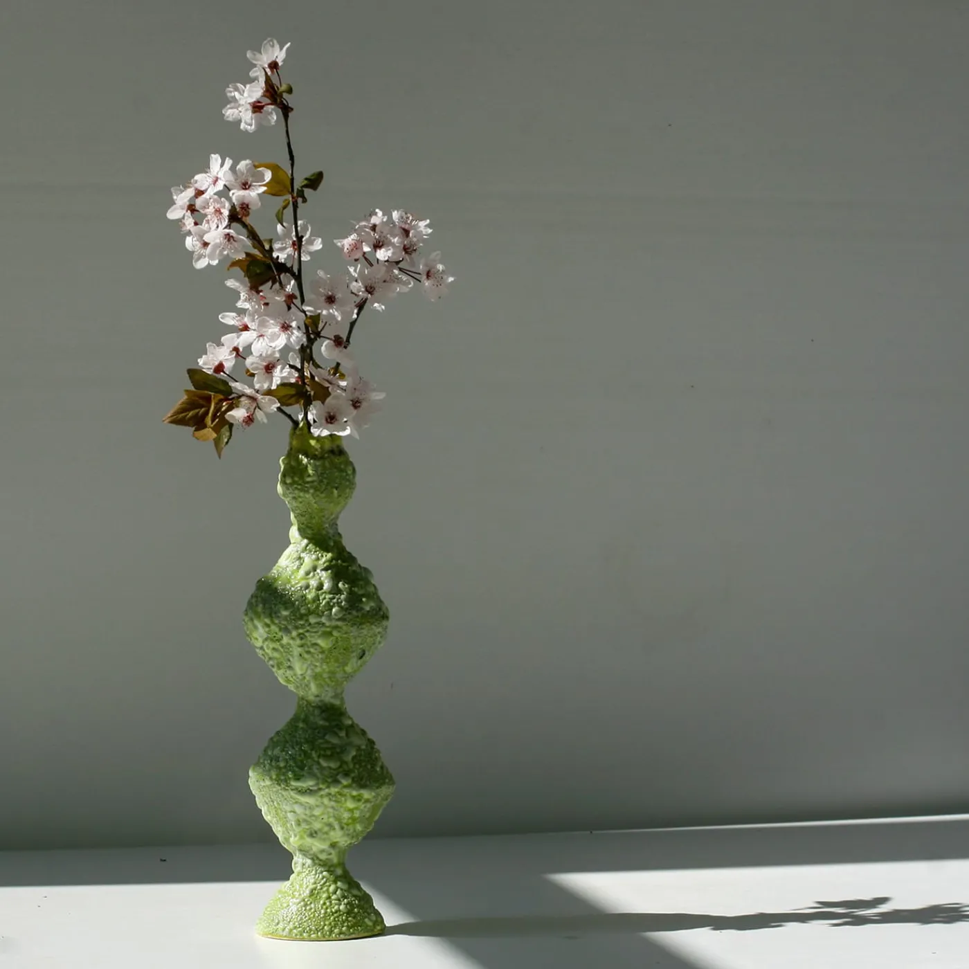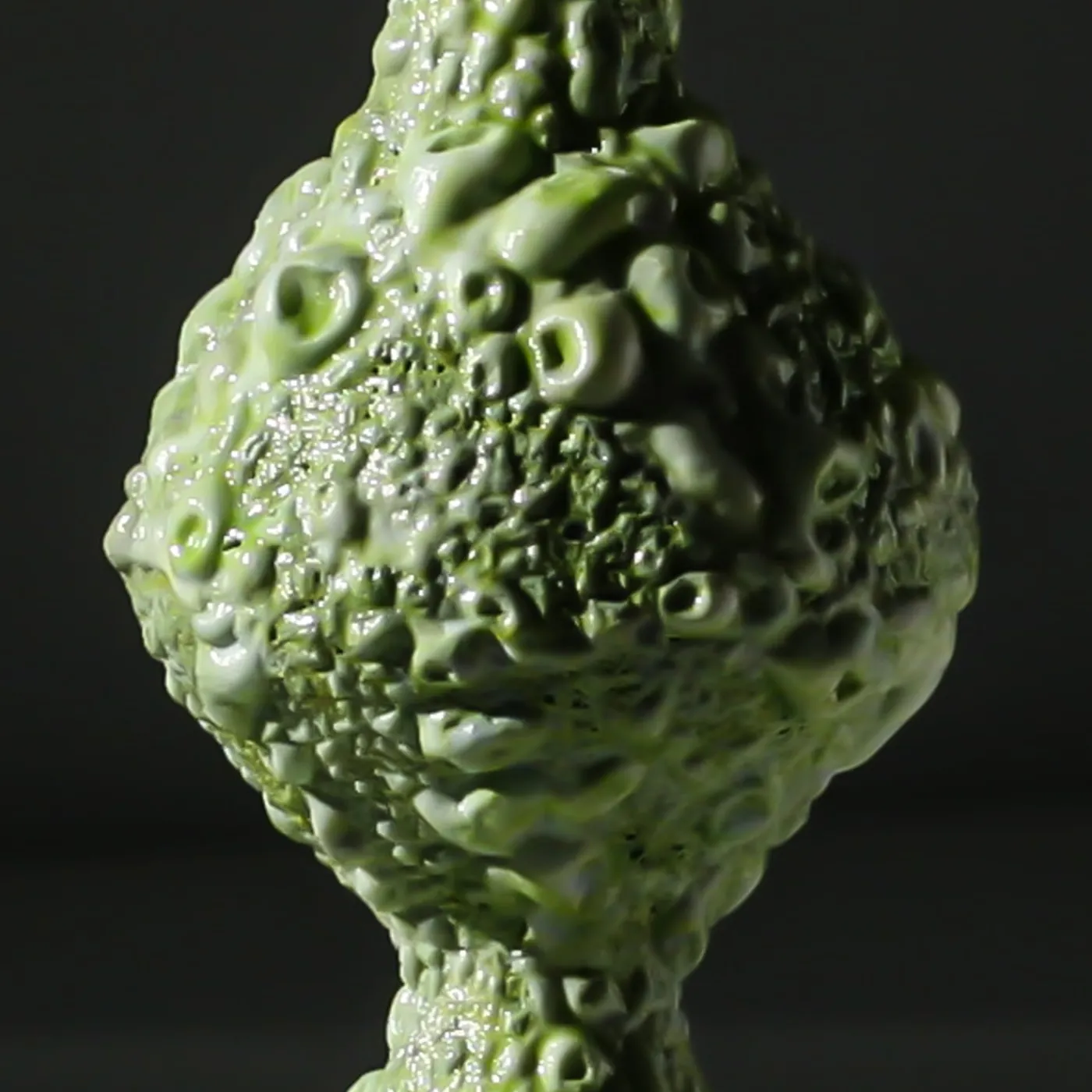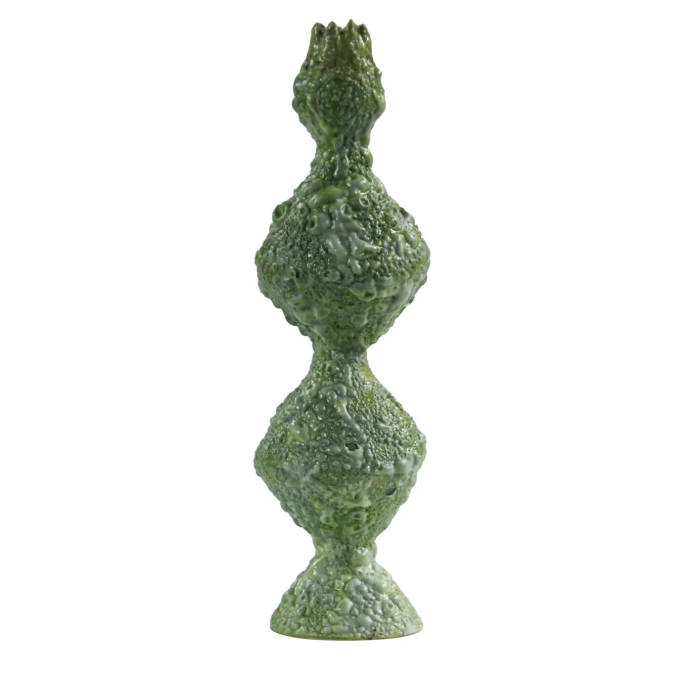 La silhouette sinuosa di questo vaso a bocciolo verde ne esprime immediatamente il carattere sensuale. Contraddistinto da una speciale texture vulcanica di piccole protuberanze e crateri ottenuta seguendo una particolare tecnica di smaltatura, la sua silhouette culmina in una bocca rientrante che ricorda il profilo di una corona. Realizzato a mano e unico, può essere esposto così com’è o con i fiori.