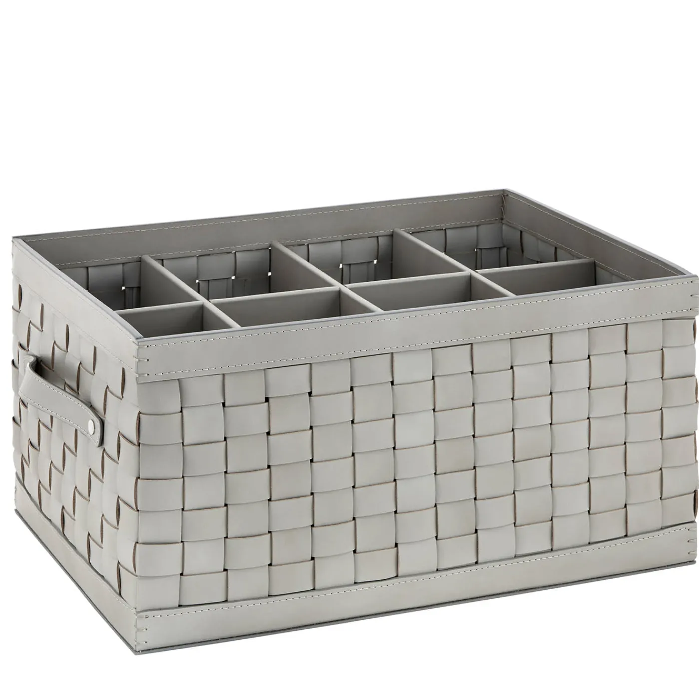 Cesti portaoggetti in pelle intrecciata dotati di manici in pelle con viti in acciaio marino e di otto divisori. Il prezioso intreccio fatto a mano gli conferisce un fascino elegante che si trasmette a qualsiasi luogo in cui viene collocato. Adatto sia per interni che per esterni. Disponibile in nero, grigio, avorio, marrone cioccolato, turchese, bianco e blu royal.