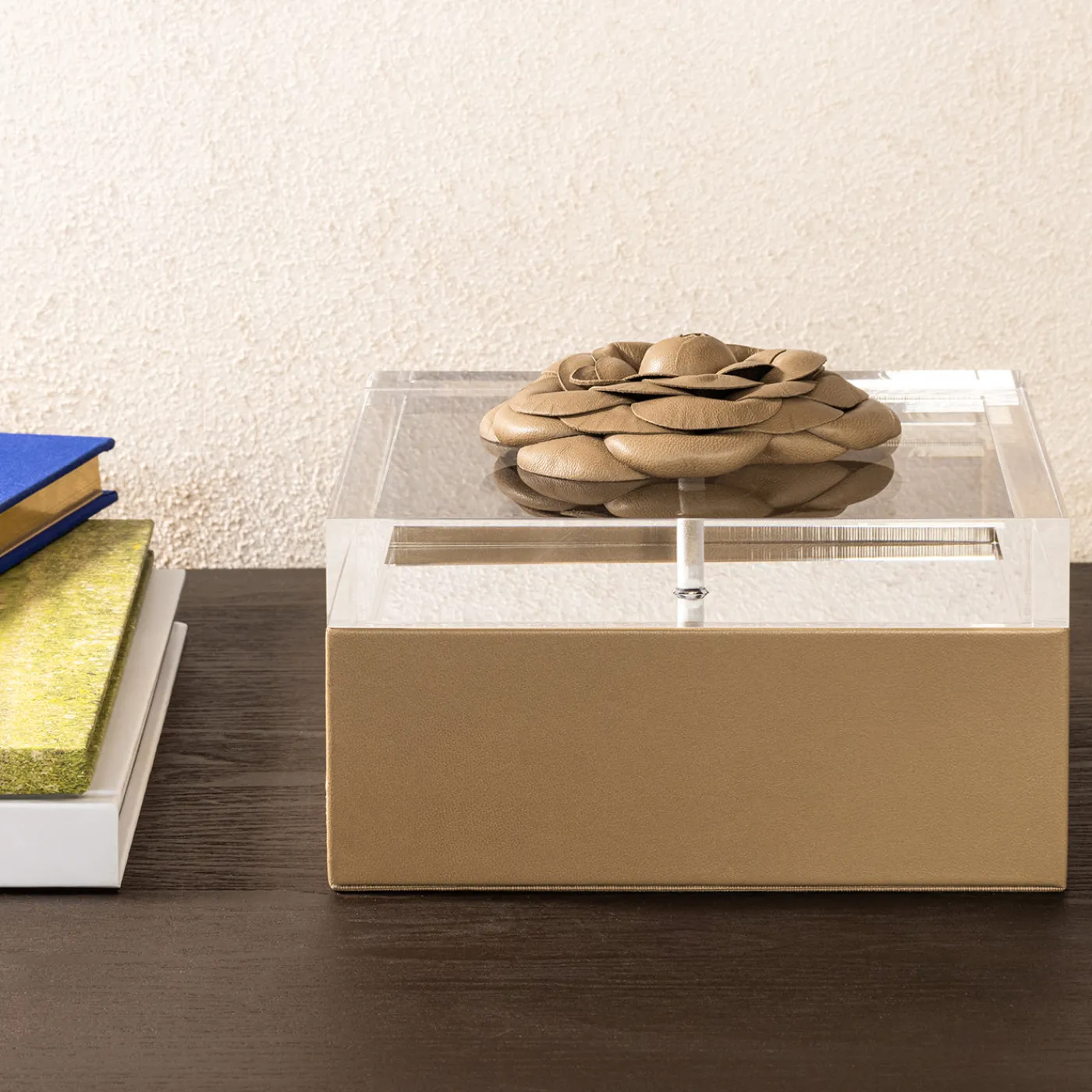 La scatola quadrata Fleur è rivestita in pelle pregiata, il che rende il suo aspetto intramontabile, perfetto per ogni tipo di decorazione e ambiente, dagli spazi classici a quelli moderni. È disponibile in diverse dimensioni e vanta un coperchio in acrilico con un fiore in pelle sulla parte superiore. Internamente ha una fodera trapuntata con imbottitura a rombi.