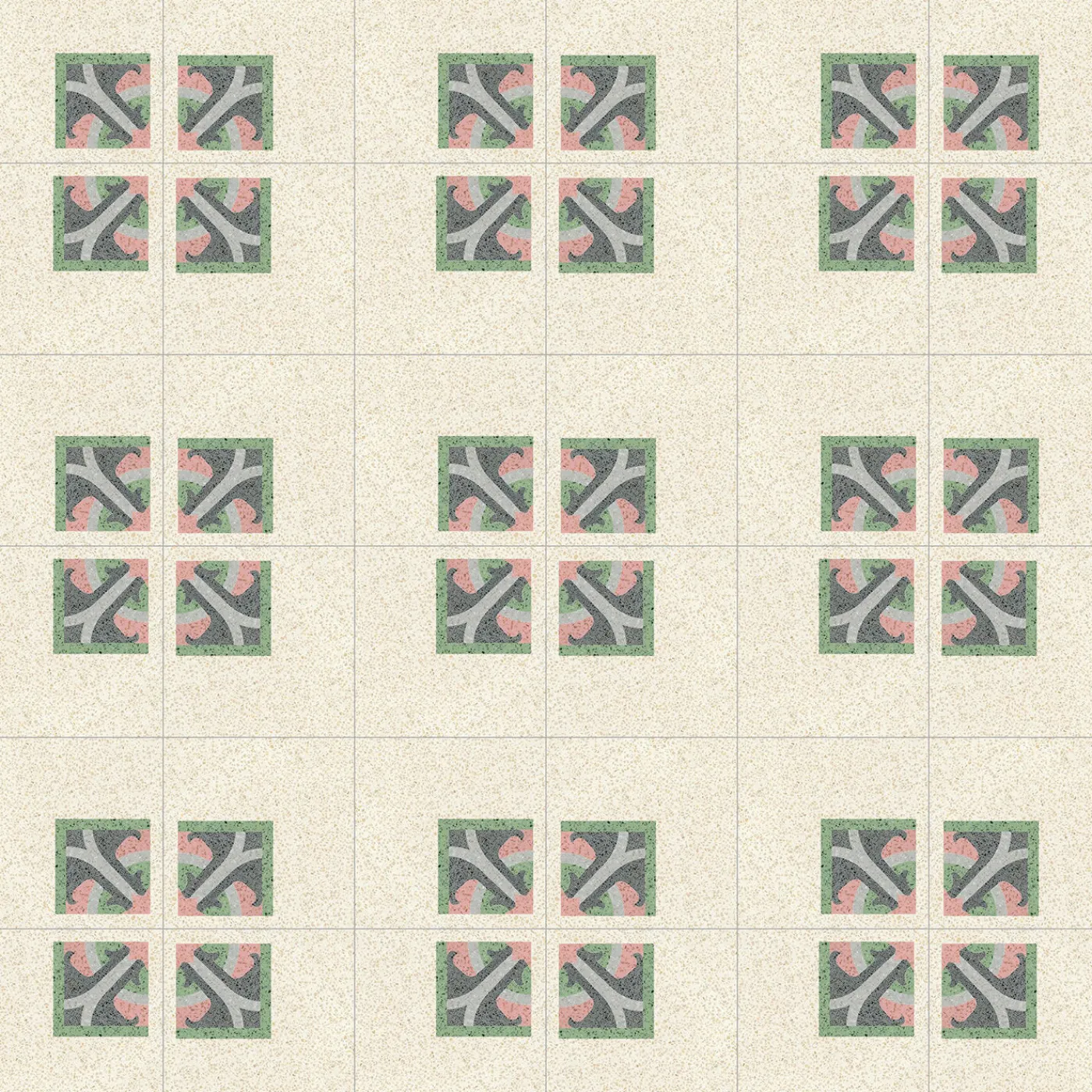 Realizzati a mano nel laboratorio siciliano di Romano utilizzando tecniche tradizionali, questi pavimenti in terrazzo sono realizzati con un’attenta miscela di cemento, granuli di marmo e sabbia vulcanica dell’Etna. Ogni piastrella è decorata a mano con un motivo geometrico che presenta forme quadrate in verde, grigio e rosa antico, su uno sfondo raffinato di bianco perla—una vera vetrina della maestria artigianale. Le piastrelle sono vendute al metro quadrato, con ogni metro quadrato che include 25 piastrelle.