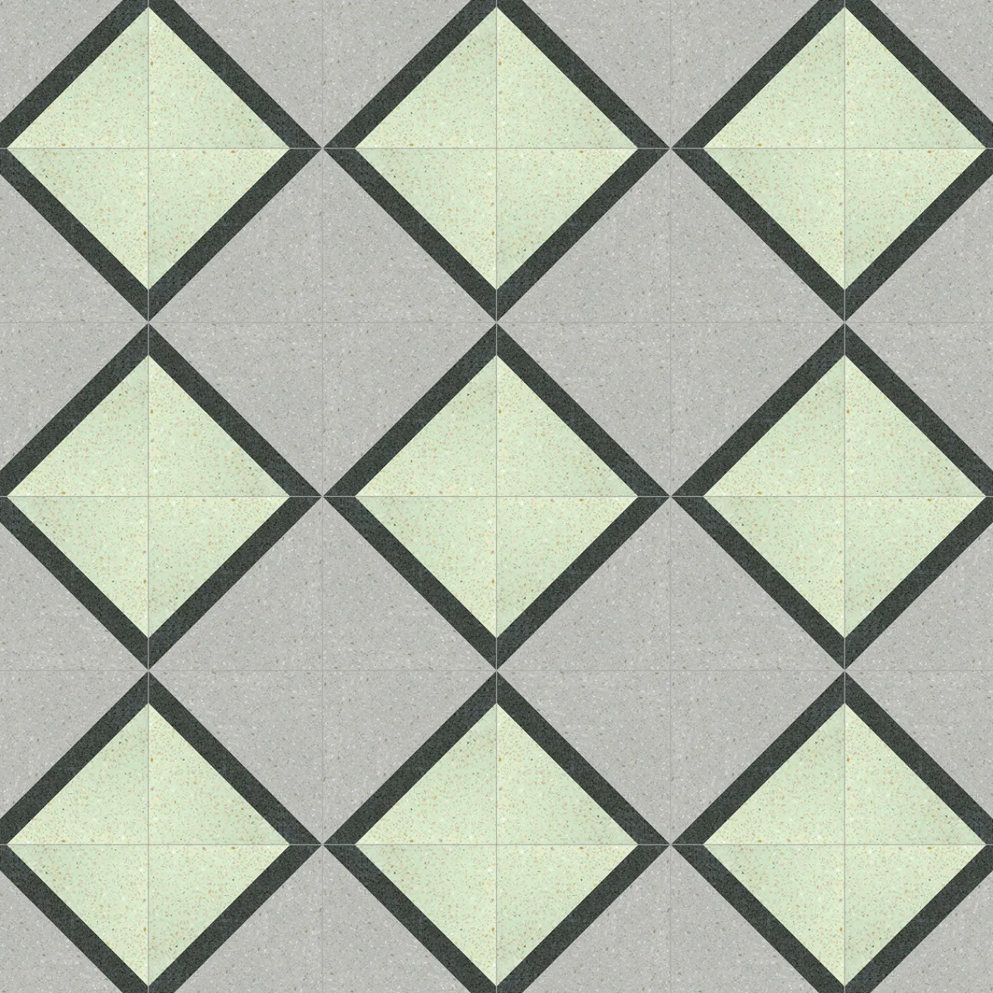 Sapientemente realizzati a mano e decorati a mano dagli esperti artigiani del laboratorio di Romano in Sicilia, queste magnifiche piastrelle in terrazzo fungono da punto focale affascinante in interni sia moderni che eclettici. Realizzate con un raffinato mix di materie prime naturali—tra cui cemento, schegge di marmo e sabbia vulcanica dell’Etna—ogni piastrella presenta un motivo romboidale delicatamente reso in linee di verde chiaro, grigio e nero ebano. Le piastrelle sono vendute al metro quadrato, con ciascun metro quadrato che include 25 piastrelle.